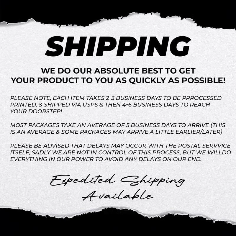 Proudly Designed & Printed in the USA All of our T-shirts are BRAND NEW and made to order. They are printed in our USA facilities with love and passion. We use various printing methods to ensure you the high quality, long lasting garments you or your loved ones deserve. If you want a different color, please take a note in your order or send us a message. Available colors: Ash, Black, Charcoal, Dark Chocolate, Dark Heather, Forest Green, Gold, Ice Grey, Irish Green, Kiwi, Light Blue, Light Pink, Maroon, Military Green, Navy, Orange, Purple, Red, Royal, Sand, Sport Grey, Tropical Blue, Turf Green, White, Antique Irish Green, Antique Orange, Antique Sapphire, Azalea, Cardinal Red, Carolina Blue, Cobalt, Coral Silk, Cornsilk, Daisy, Graphite Heather, Heather Navy, Heather Red, Heliconia, Lime, Natural, Sapphire, Tweed. Material: 5.3 oz/yd², Dark Heather, Graphite Heather, Heather Navy, Heather Red, Tweed (50% cotton, 50% polyester); Sport Grey, Antique Irish Green, Antique Orange, Antique Sapphire (90% Cotton/10% polyester), Ash (99% Cotton/ 1% Polyester), All Others (100% cotton). Classic, unisex fit - Comfortable to wear and suitable for anyone to wear. Non-stitched, classic width, rib collar. Printing technique: Direct to Garment. Size: S, M, L, XL, 2XL, 3XL, 4XL, 5XL. Delivery Time: USA: Approximately 2-7 business days Shipping Carriers: USPS Note: Business days exclude weekends and holidays. Return & Exchange Policy: Quality Guarantee: We stand behind the quality of our products and workmanship. Any defects or errors on our part must result in a refund/replacement at no charge. Conditions for Returns: Returns are generally not accepted for user errors such as incorrect selection of sizes, designs, or colors. Returns/Replacements are acceptable for damages such as poor printing results, incorrect size or design caused by us. If you have any questions regarding this item or any other item we have for sale, do not hesitate to contact us. We answer all messages within 1 business day !!!