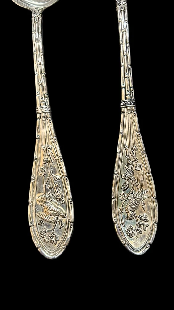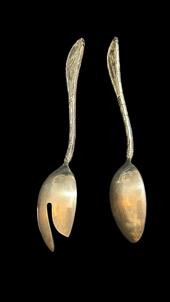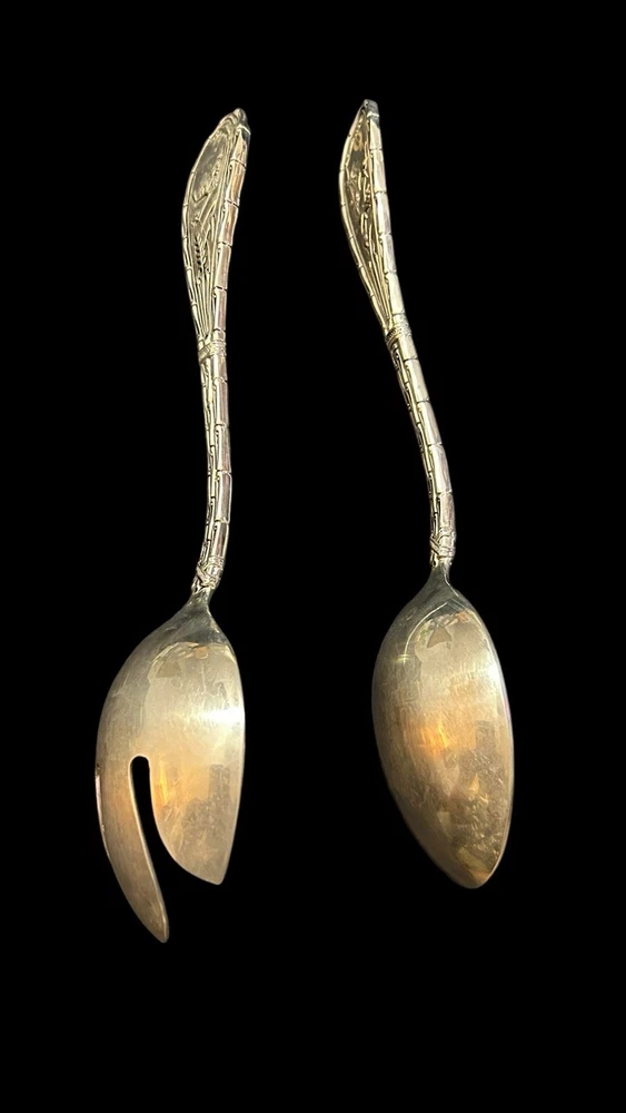 Bombay Silver Plate Salad Serving Utensils Fork & Spoon 11.5” Birds Bamboo 3D Good vintage condition. Normal signs of use, there is patina and minor scratches. The boxes has some scuffs and scratches. Please study pictures carefully before purchasing Feel free to ask us any questions. Thank you for visiting our store! Clt