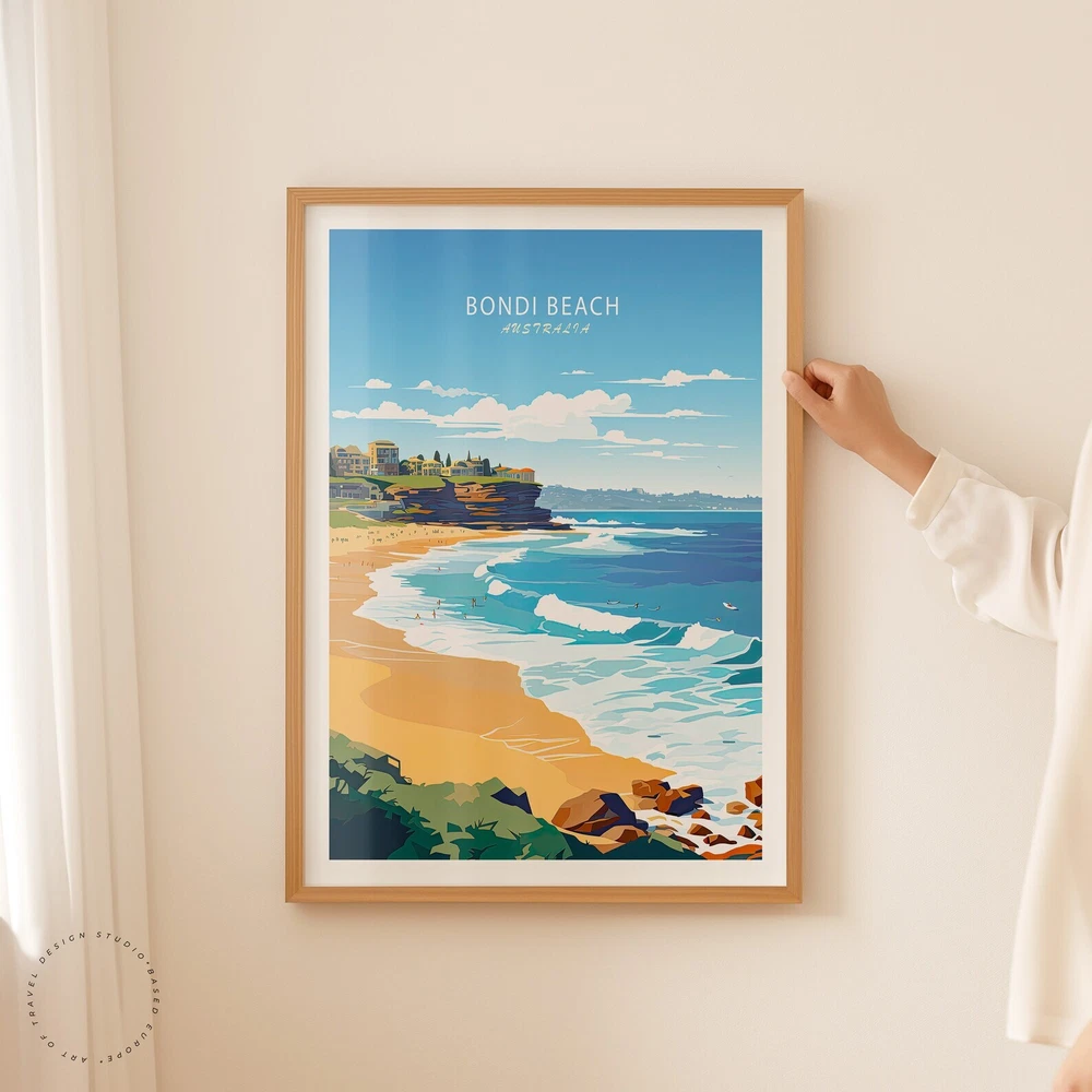 Bondi Beach Travel Poster Australia Wall Art Bondi Beach Print Custom Travel Poster Wedding Present Home Decor Material: Premium luster photo paper Print type: Inkjet printing One side printed + The finish provides the highest possible resolution and color saturation + Lasts up to 200 years in color and 400 years in black-and-white + Printed on high-quality resin-coated photo base paper medium + Posters can be hung with double-sided tape, tacks, or framed + Hand washing with a gentle cry cloth is recommended for extended durability I will hand select the best choice of paper for your chosen design to ensure top quality results for a beautiful, bright and luxurious print. All prints are sealed in cellophane slips for protection during transportation, and are shipped in a protective cardboard envelope.