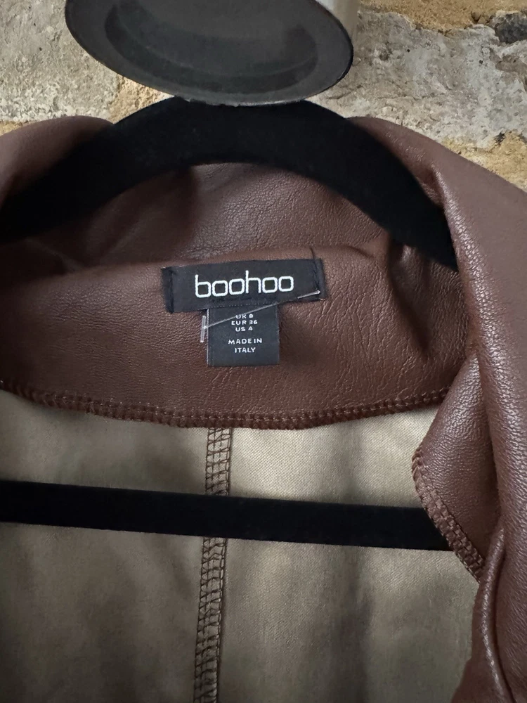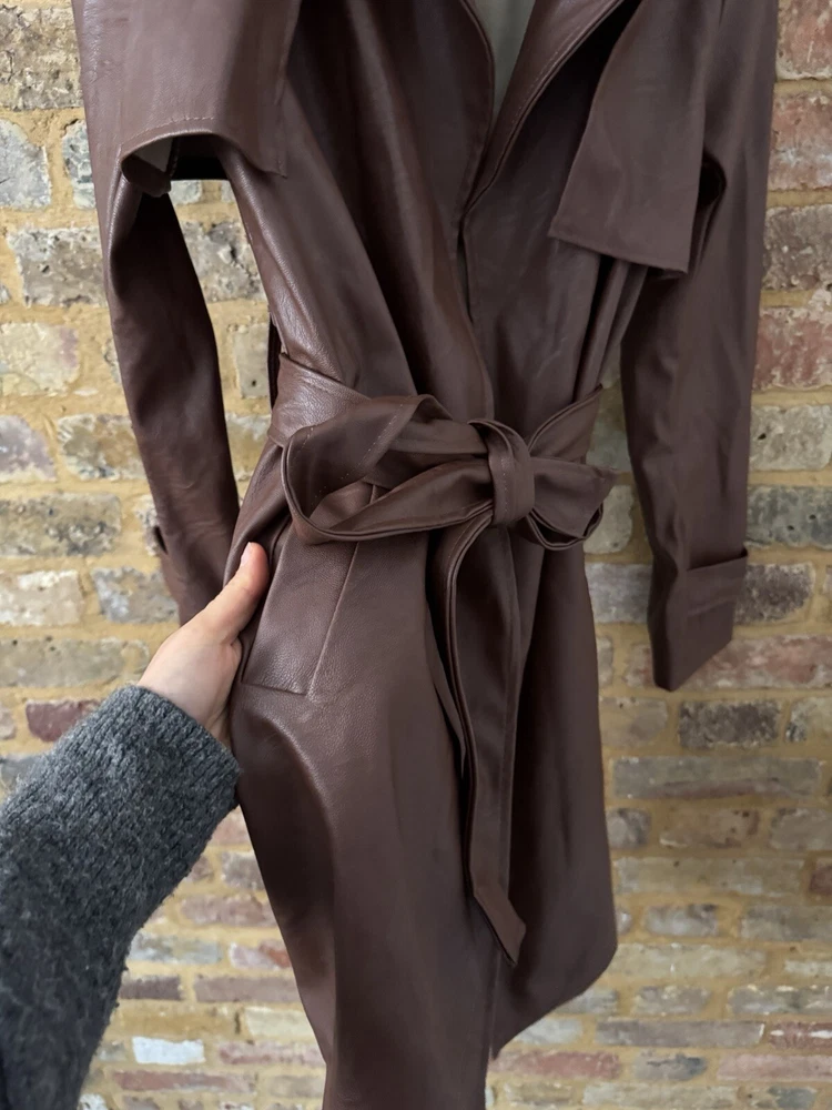 Boohoo Trench Coat Jacket Belt Button Up Small Faux Leather Size 6 Brown New no tags bought for £79 Same dsy postage if purchased by 2pm
