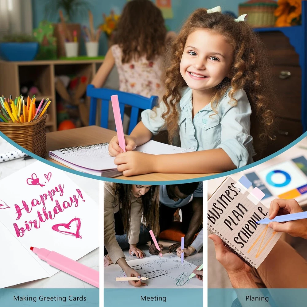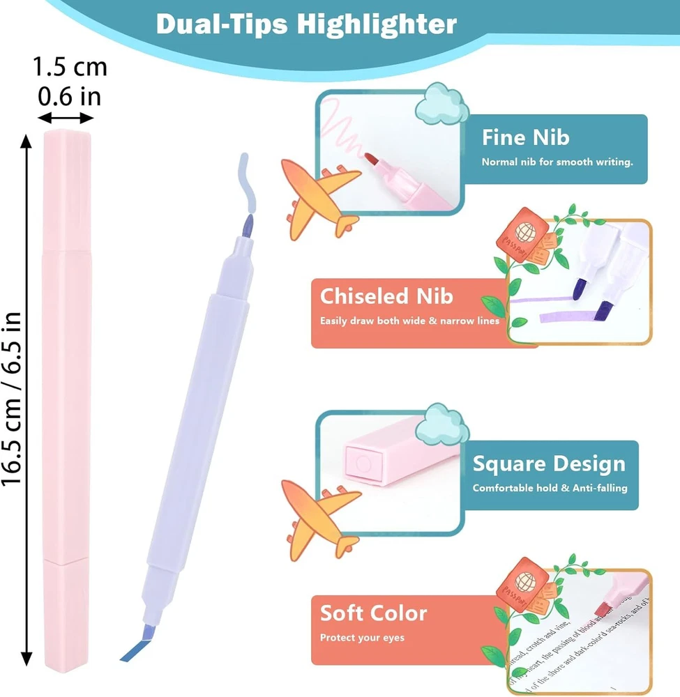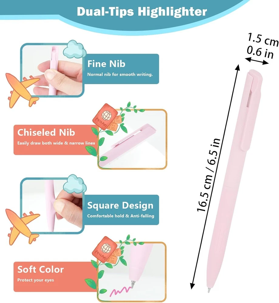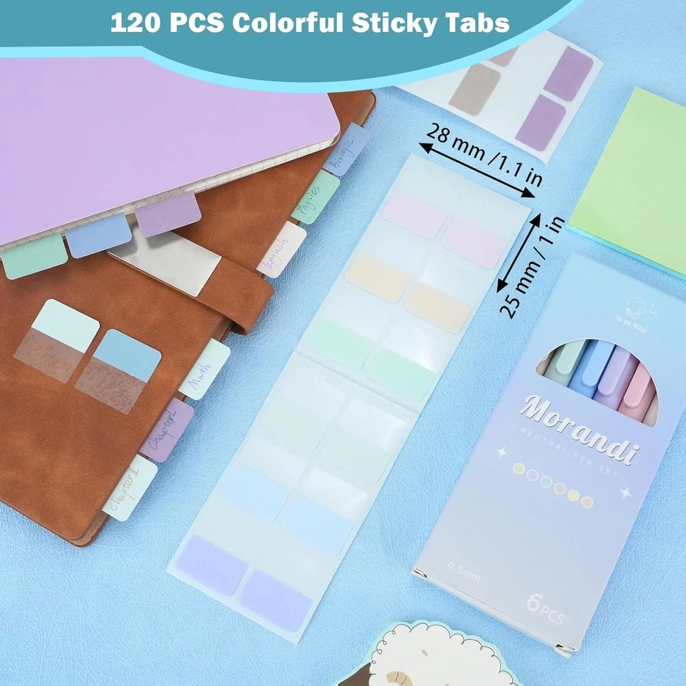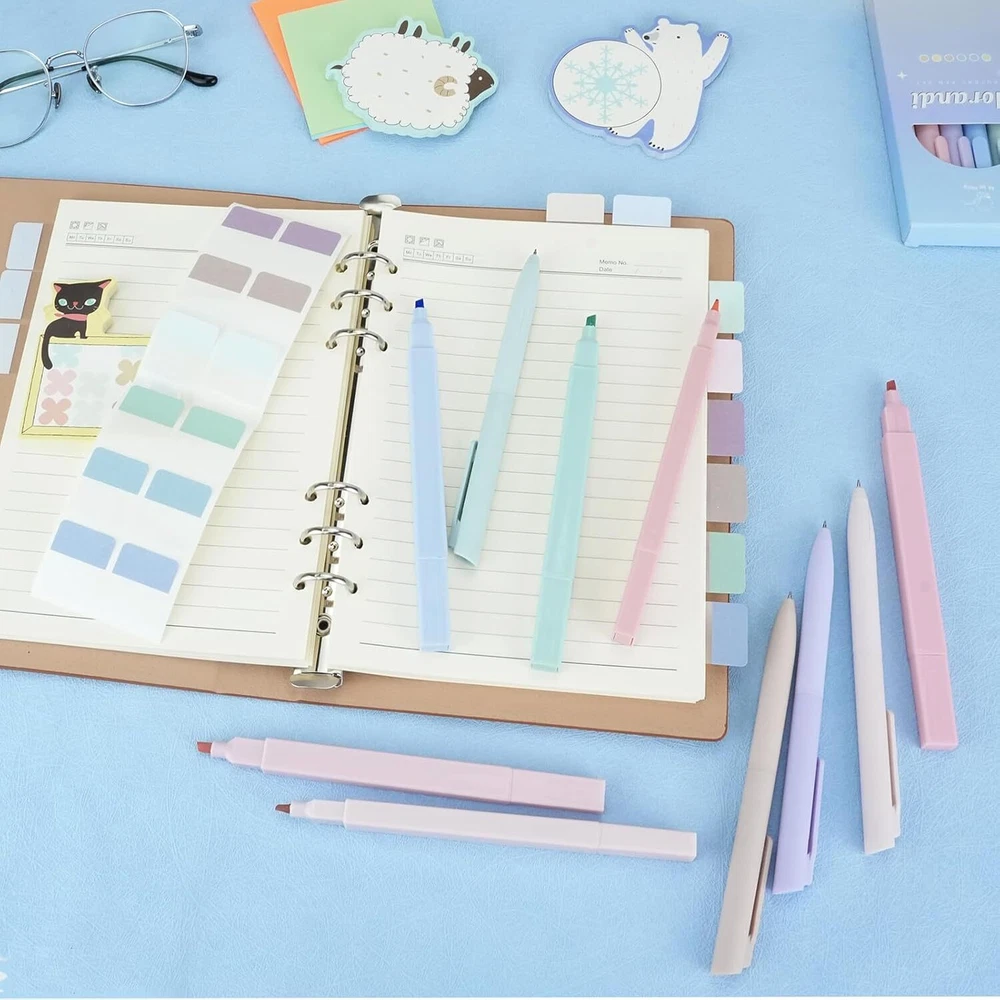 Product Description Package includes: 6x highlighters 6x colored gel pens 120x book tabs CHOKING HAZARD -- Small parts. Not for children under 3 yrs. 🎁[Value Combination for You] Package includes: 6x highlighters + 6x colored gel pens + 121x book tabs. The aesthetic school supplies set in harmonious and vibrant colors helps you marking the highlight and increase efficiency while keeping you stylish, making reading, studying, and working easier. ✨[Double Ended Highlighter] Unlike other single-tip highlighters, our dual-tips highlighters not only have chiseled nibs that can easily draw both wide and narrow lines for large smearing and precise underline, but also have normal fine nibs for normal writing. One pen for multiple uses makes learning and working more efficient and saves storage space. The soft color highlights the key points without covering the content, making the content eye-catching without hurting your eyes. 🌈[Colorful Gel Pens] The Morandi colored aesthetic pens offers 7 different colors for smooth writing. With a non-slip and soft silicone grip, this pen is very comfortable to hold. Each pen has a portable clip that can be clipped to a book or pocket for easy carrying and storage. The retractable design is not easy to dirty the pen case or pocket. 🏷The 1*1.2inch colorful sticky tabs help you mark key points or categorize documents. One half of the tab is transparent which won't block the content. The other half is suitable for writing with a gel pen, fountain pen, ballpoint pen or pencil which is convenient for you to mark the tips or notes needed. The annotation tabs are self-adhesive, so you can stick them over and over again, and they won't damage the paper when you tear them off. 🖍Highlighting Bible, notes, journals, or any book you want to read in vibrant colors! They are ideal for Bible study supplies, book annotation kit and aesthetic school supplies. These cute pastel pens are lightweight, small and not bulky, perfect for journaling, planning, working, studying, taking notes, annotating at school, college, home, office or even while traveling.