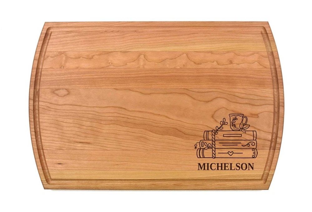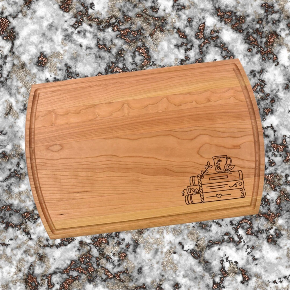 Design: Personalized Books With A Cup Cutting Board or Charcuterie Serving Tray All items ship via USPS - please make sure your address is correct :-) Whether used as a charcuterie serving tray for snacks or cutting board, our bamboo, walnut and cherry custom boards are the perfect addition for the home and make the perfect gift for your loved one celebrating a birthday, anniversary, new home, wedding, etc! *** FEATURES *** • SIZES: We have multiple styles and sizes available. To see our current sizes available, click the drop-down menu. The photo slide contains a photo showing each side by side. Please note, the board with the juice groove only has the groove on the front side of the board. • THICKNESS: Bamboo Boards - Approximately 1/2" Thick; Walnut & Cherry Boards - Approximately 3/4” Thick • UNIQUE: Every board is unique with the grain and coloring varying throughout - no board is the same! • CARE INSTRUCTIONS: Hand wash only with warm water. Do not soak. Please apply mineral oil throughout the board’s life. • PERSONALIZATION/CUSTIMIZATION: Do you want the text placed differently on the board? Please don’t hesitate to contact us. All personalization notes can be entered in the personalization box when checking out. • SHIPPING: All cutting boards ship within 2 to 5 business days. • WHOLESALE ORDERS: Please don’t hesitate to contact us for information about wholesale orders. Processing times for larger orders may change. • NOTE: Colors can vary a bit on different monitors and screens. Any props included in photos are not included. Please be sure to double-check your address to make sure it is accurate for USPS delivery. If a package is returned to us due to an invalid address, the buyer is responsible for all additional shipping charges. We appreciate you supporting small business – best wishes! For items ordered with simple edits, we do not send proofs since the layout doesn't change from the example(s). However, in the event there are requests that change the layout from the example(s), we do send proofs for approval before making the product. If you'd like a proof before we make the product, please note so in the personalization box.