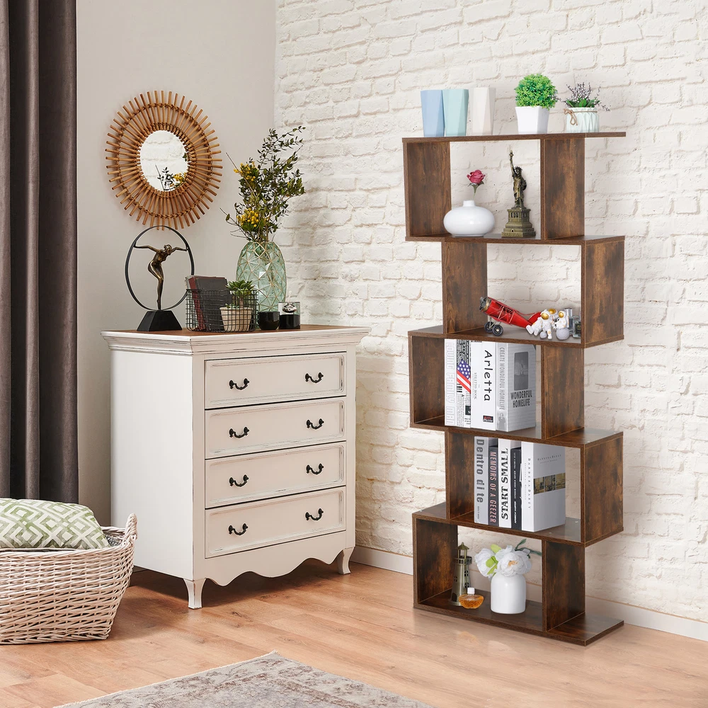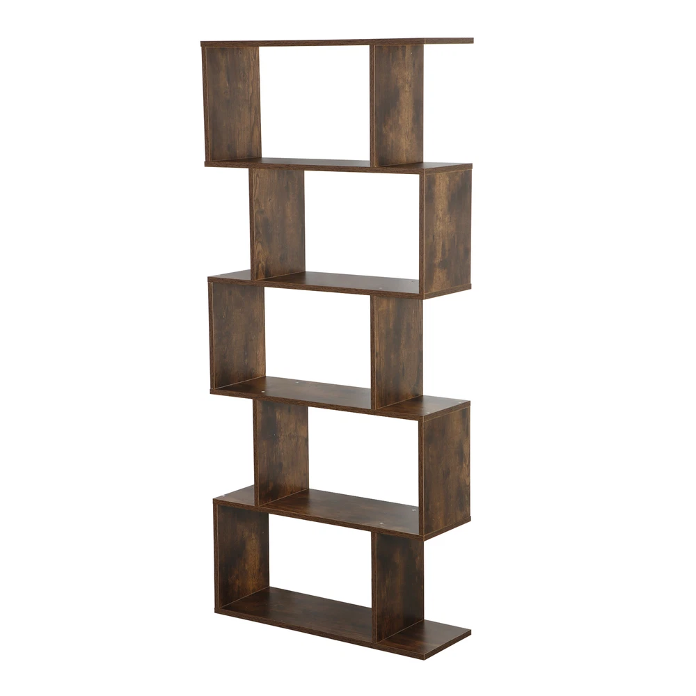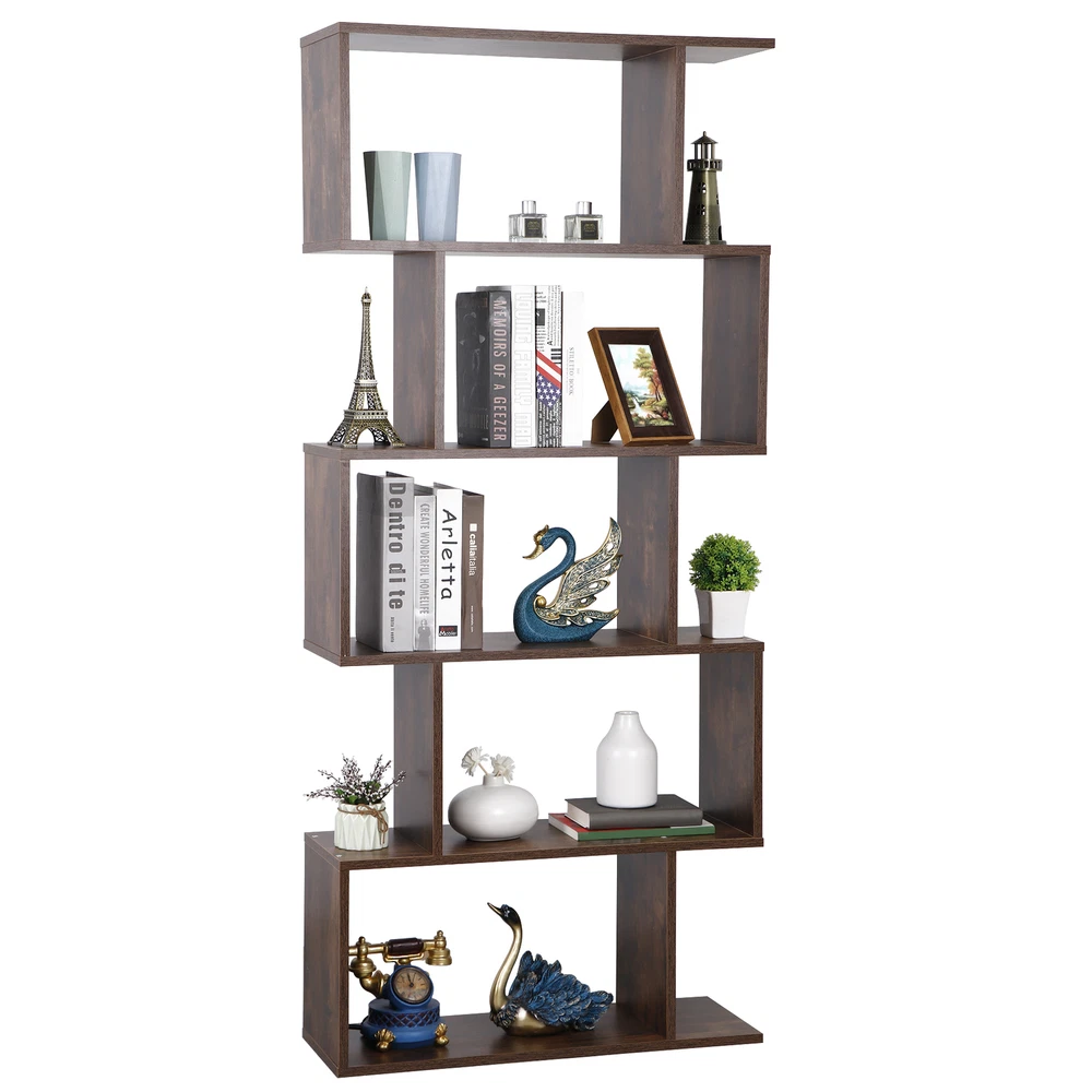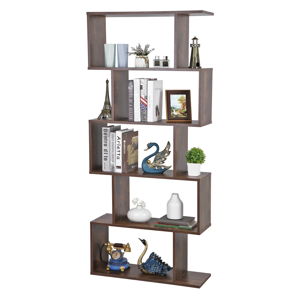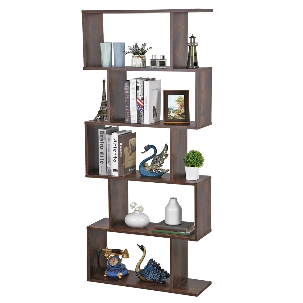 Features: 【 5-tier S-shaped Bookcase】 The open storage shelf bookcase is made of solid chipboard, it is solid to use, and stable retro look solid legs, making it sturdy to use, espeacially s-shaped design. 【Rustic Color for Home Decor】 The Chipboard Cupboard is beautiful appearance, which is in rustic brown, This adds the perfect pop of color to the room in progres the cozy color will add a simple and elegant taste for your room. 【Easy to Set Up】 All parts and manual are included, it will take a few mintues to assemble. If you have any problem assembling it, please contact us, we will help you. 【Ideal Storage Divider Bookshelf】 The 5- Shelves s-shaped bookcase which can be used to clarrify different books, or some other home stuff. Holds a decent amount of books, It will make your home organized and clean. S-shaped style is so retro to make your room cozier. 【Maximize Your Storage Space & Books Classification】 Eliminate clutter and maximize space, Create storage and display space for any living area in the home. Different compartments to sort different books. 【Easy to Clean】 Smooth finish makes it easy to clean with a damp cloth or sponge. 【Wide in Use】 Our 5-tier s-shaped bookshelf is good for clothes storage, book storage, decoration display, plants platform and so on, it can meet your needs when you want to add a organizational atomosphere. 【Customer First Principle】 If you have any problems with the item, please contact us first and you can send us message directly on eBay, we willl give you the satisfied solution. Specifications: Color: Rustic Color Material: PB, MDF Item Weight: 40.92lb Overall Dimensions: 27.56 x 9.45 x 62.6" Weight Capacity: 33 LBS / Shelf