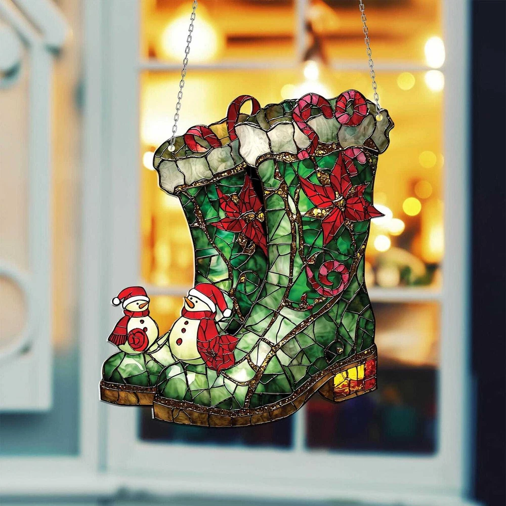 Boot Christmas Acrylic Window Hanging Festive Holiday Decoration With Snowmen Design Cheerful Suncatcher For Seasonal Decor Gifts For Her This Custom Shape Window Hanging Acrylic Ornament could be the perfect decoration for your home. Material: Strong and durable 3mm-thick acrylic sheet Easy to hang: 2 holes for attaching stainless steel chain Hanging chain length: 15.7 inches – Perfect to hang on the car, on the window, or any other place. UV printing and laser cut technology provide high-quality long-lasting prints and sharp and clean edges. Thickness: 3mm. Maximum sizes: 6×6 or 9×9 inches. 2-sided printing: Artwork is visible from two sides. Window Hanging Acrylic Ornament comes with a hanging chain and a suction cup to hang on your windshield or car windows. More than a decoration item, this window hanging ornament is also a perfect gift for friends and families.