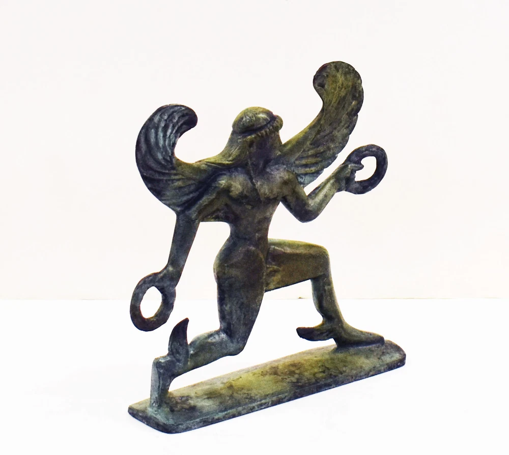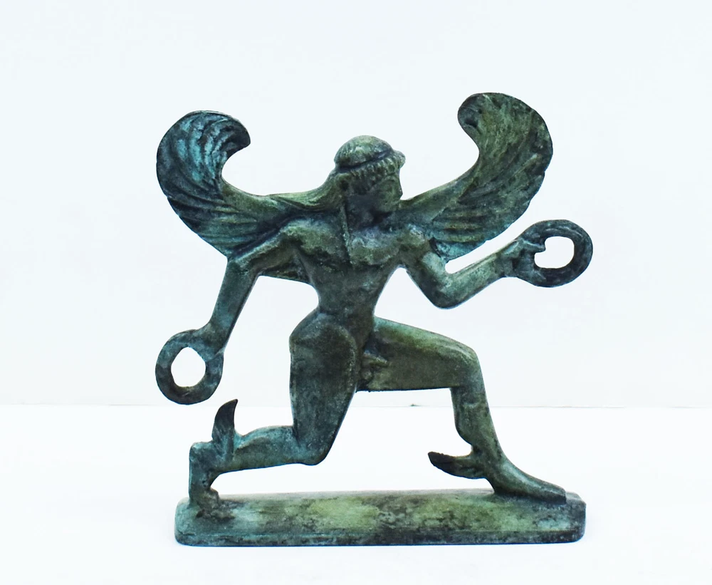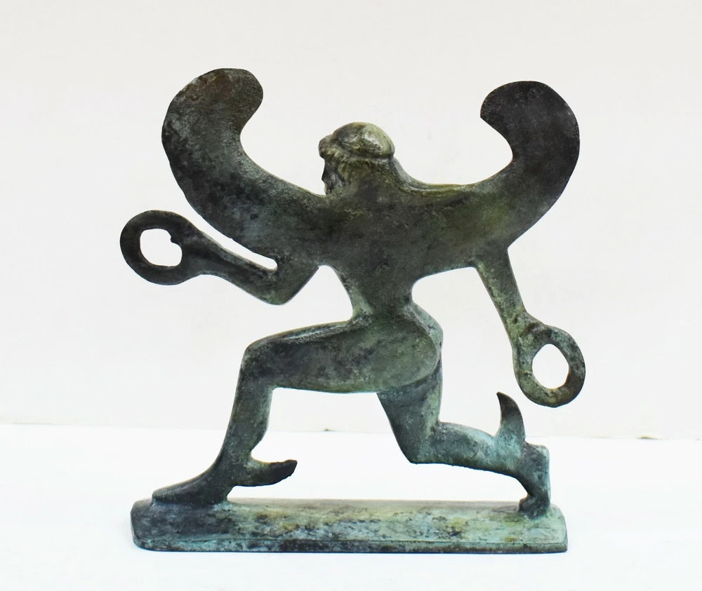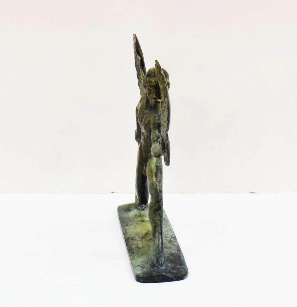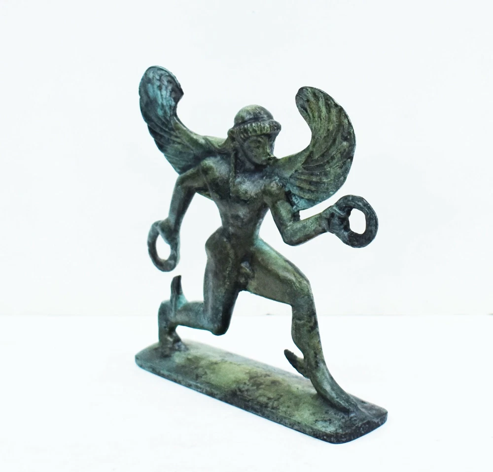 BOREAS BRONZE FIGURINE BOREAS was the purple-winged god of the north wind, one of the four seasonal Anemoi (Wind-Gods). He was also the god of winter who swept down from the cold mountains of Thrake (Thrace), chilling the air with his icy breath. Beyond his mountain home lay Hyperborea, a mythical land of eternal spring untouched by the god's winds. When Boreas sought a wife, he carried off Oreithyia ("Mountain Gale"), daughter of King Erekhtheus (Erechtheus) of Athens, who was playing with her companions in a riverside meadow. Their children included Khione (Chione), goddess of snow, and the Boreades, a pair of winged heroes. Boreas and his brother-winds were often imagined as horse-shaped gods in form. An old Greek folk belief was that the winds Boreas and Zephyros would sweep down upon the mares in early spring and fertilize them in the guise of wind-formed stallions. The horses born from these couplings were the swiftest and finest of their kind. The fabulous horses of King Laomedon of Troy were said to have been sired in this way by Boreas upon the Trojan mares.Boreas' name is simply the ancient Greek word for "north-wind" which was perhaps in turn derived from the Greek verb boraô meaning "to devour". All our bronze items, are cast in Greece, using the traditional 'lost wax' method. As nothing is mass-produced, there will inevitably be slight variations in patination and colouring. Each piece is, therefore, unique.(25-528-A) Details: Condition: New, Handmade in Greece Material: Pure Bronze Height: 12 cm(4.7 inches) Width : 12 cm(4.7 inches) Length : 3 cm(1.2 inches) Weight : 400 g