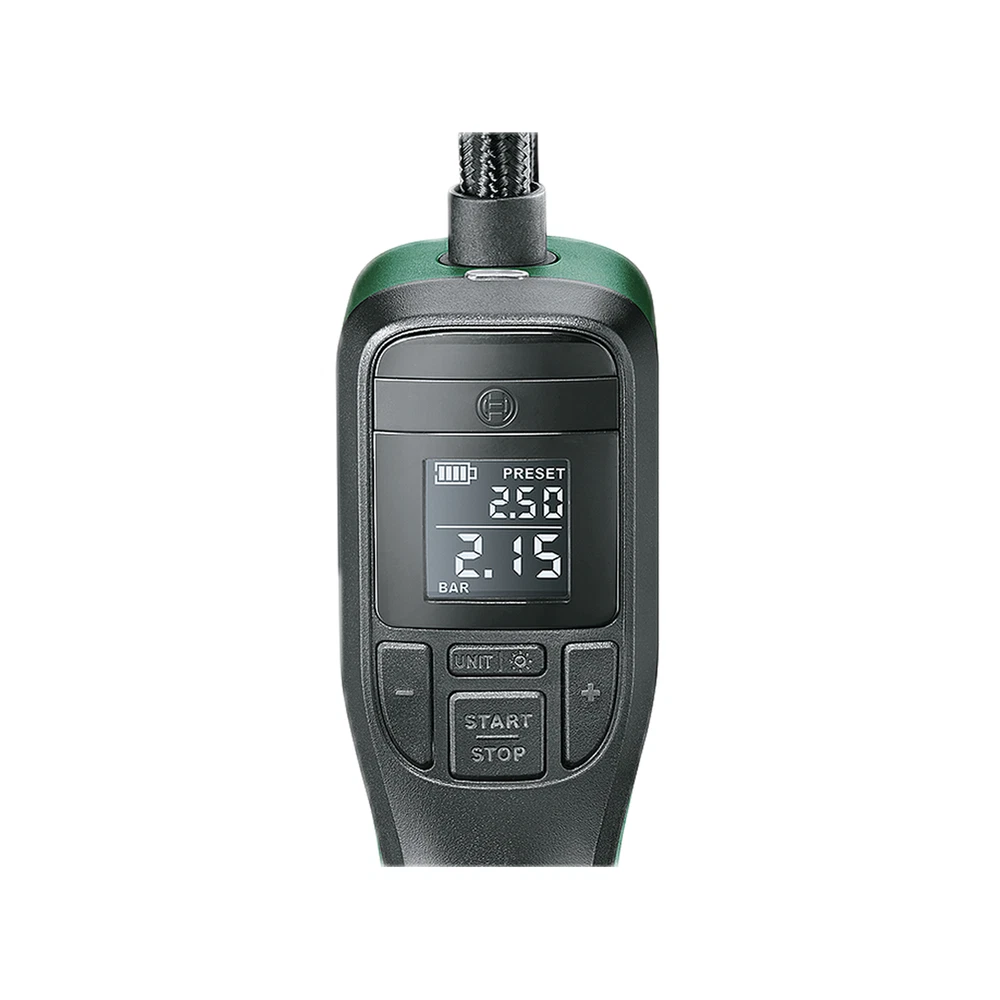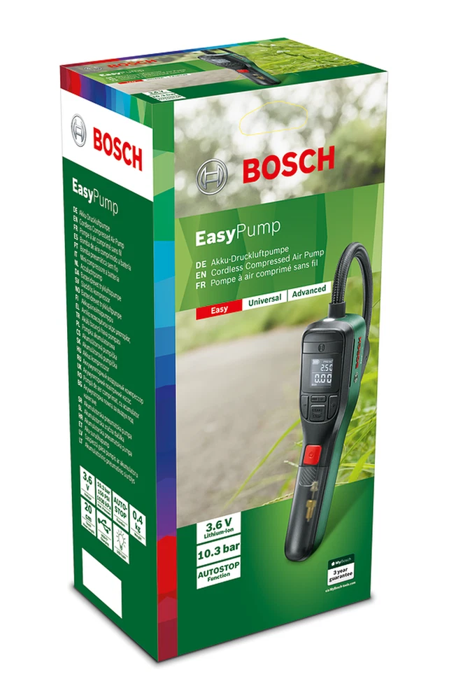 Description At home or on the road: Bosch’s intuitive and handy pressure pump Product video Max. pressure: 150 PSI / 10.3 bar / 1030 kPa Battery voltage: 3,6 V Battery run time: 6 Trekking wheels (28x1.5 700x38C), 0 - 4,5 bar Ø Pumping duration 0 - 4,5 bar: 2:13 min Air flow at 0 bar: 10,6 l/min Hose length: 24 cm Autostopp function: yes Weight: 0,43 kg Scope of delivery 1x EasyPump 1x French-valve 1x Ball needle 1x Volume adapter 1x Quick-release adapter (valve lever connector AV) 1x USB cable 1x Textile bag Specification Weight (net)0.43 Kilogram Weight (gross)0.85 Kilogram Dimensions21,5 x 4,9 x 10,6 cm