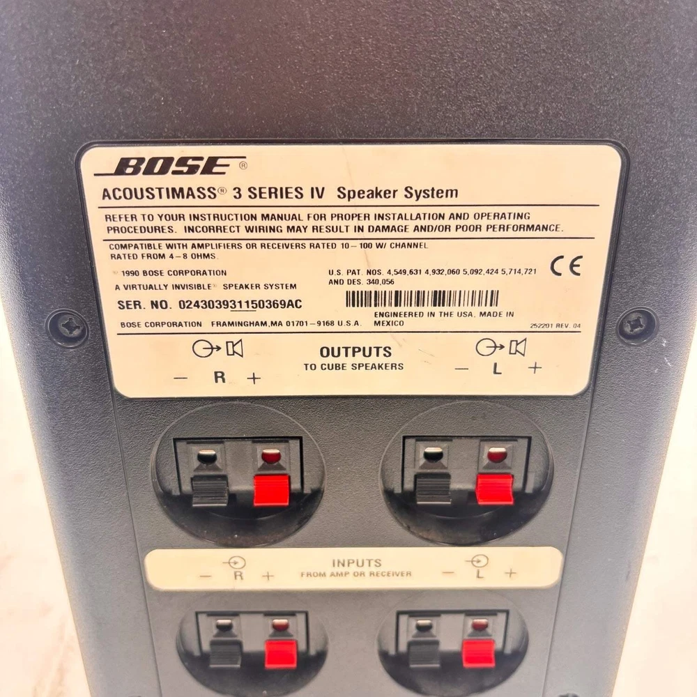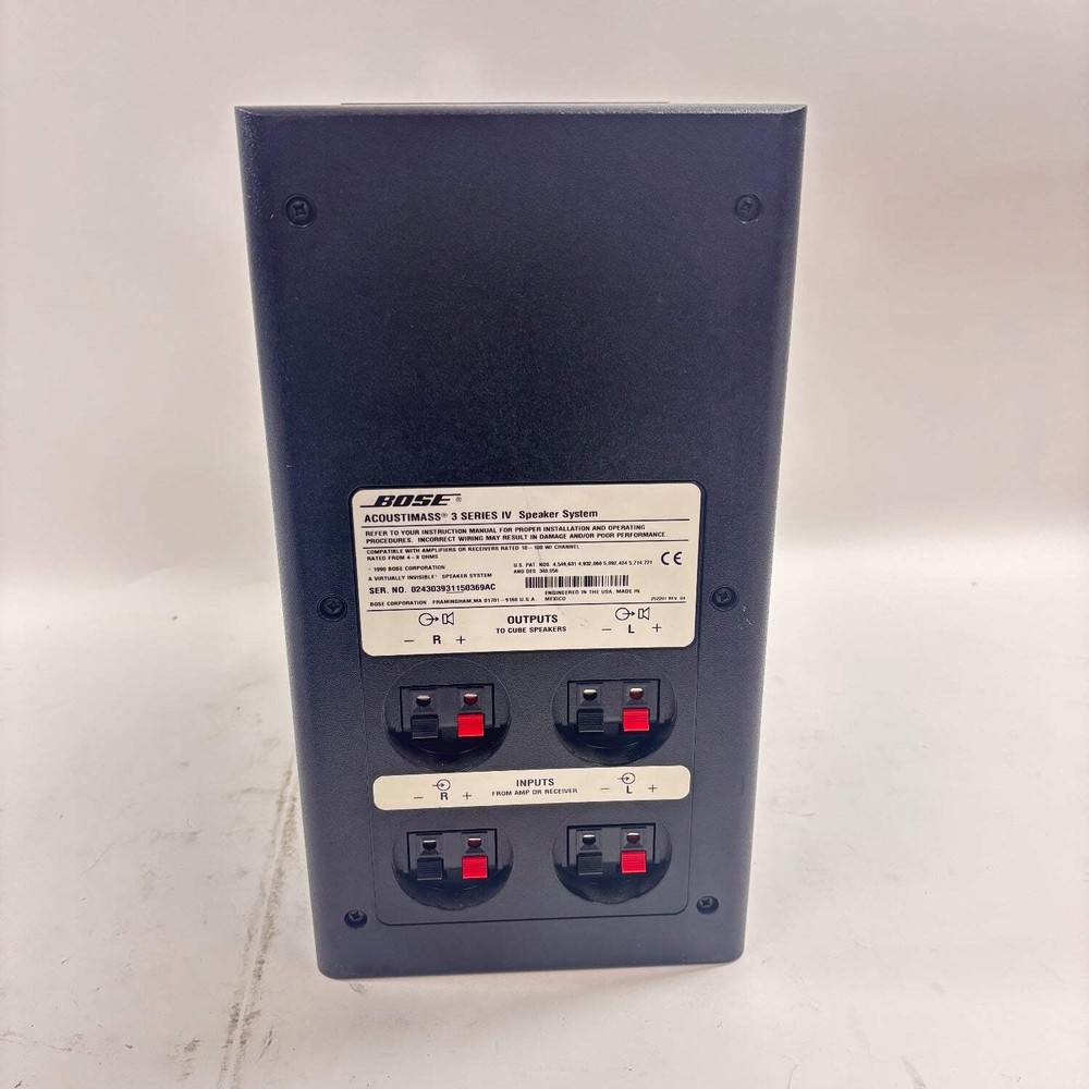 The Bose Acoustimass 3 IV Speaker System is the ideal solution for users who appreciate Bose speakers in a streamlined size. These sleek stereo speakers feature the exclusive Acoustimass center module, which works in harmony with a pair of 3-inch square speakers to handle low frequencies across all channels with excellent clarity. Users enjoy music and movies with a renewed appreciation thanks to sounds from the lower registers, reproduced through the stereo speakers without noticeable distortion. All three components of the Bose Acoustimass 3 IV offer top-notch performance and no unnecessary bulk. The base of the Bose speakers has rubber feet for stability on slick surfaces without damaging the underlying material. Additionally, the speakers have internal magnetic shields, allowing for placement near televisions sets without negatively impacting picture quality. Finally, before reaching consumers, the components of the Bose Acoustimass 3 IV are carefully tested by computer to ensure reliability and quality control.