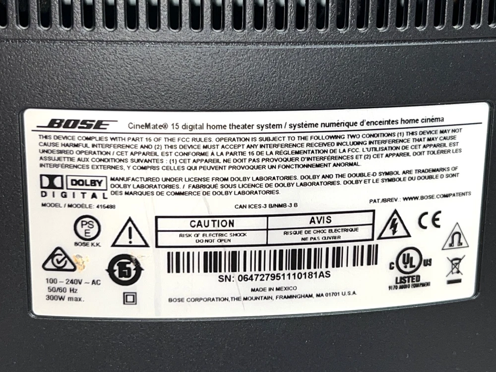 Bose CineMate 15 Home Theater Cinema Speaker System With IR Remote Control, Soundbar, Digital Optical Cable, Power Cords, and Instruction Manual. Batteries not included. Great gently used tested working condition. Minor normal usage wear including 4 small dings/on the top side edges, see pics.
