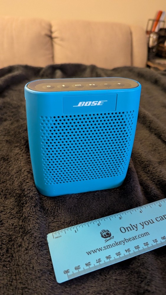 The Bose SoundLink Color Portable Speaker System in Blue is a 2.0 channel wireless Bluetooth speaker designed for universal compatibility. It features a cube shape made of plastic, with dimensions of 5.3 inches in height and a weight of 1.25 lbs. The speaker has a RMS power of 40 W and includes audio inputs for USB and banana jack connections. With its portable and compact design, this Bose speaker is ideal for enjoying high-quality audio on the go.
