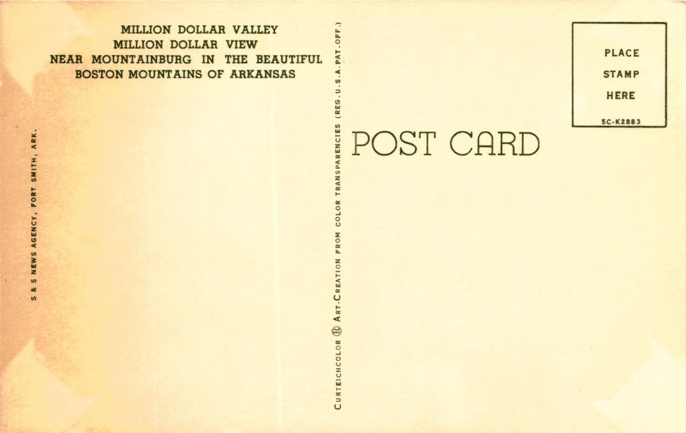 The postcard features a scenic view of the Boston Mountains in Arkansas, specifically near Mountainburg. The area is known for its stunning landscapes and outdoor recreational opportunities. The Boston Mountains are a subset of the larger Ozark Mountains and are characterized by their rugged terrain, dense forests, and picturesque vistas.