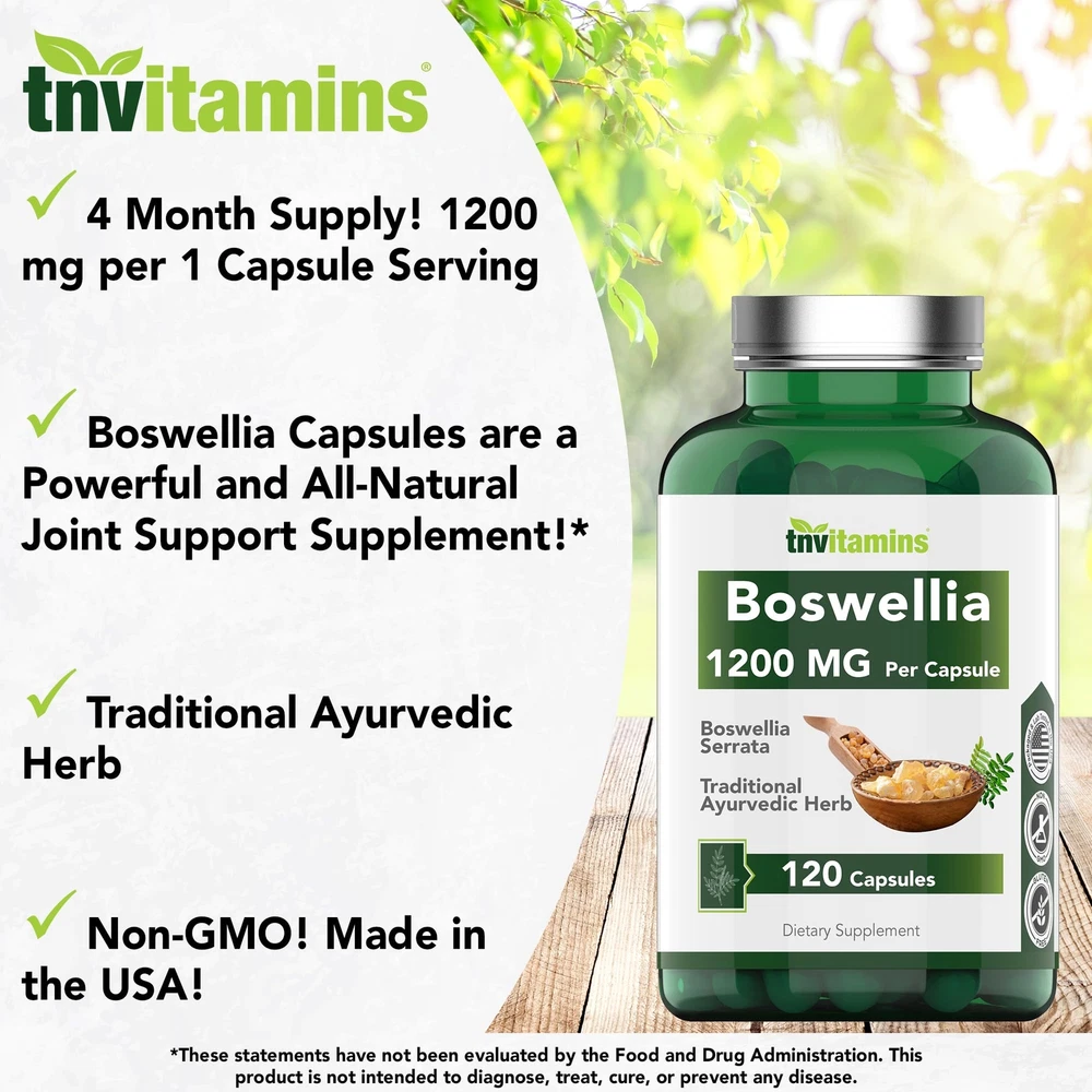 What is Boswellia Serrata Extract? Boswellia serrata is an Ayurvedic herb. These herbs and spices aim to preserve and wellness by keeping the mind, body, and spirit in balance and preventing disease rather than treating it. Our Boswellia adhere to this approach and offer a variety of benefits. The Boswellia serrata tree is commonly found in India. Its resin is known to have therapeutic value for anti-inflammatory, and analgesic activity. Boswellia serrata is a plant that produces Indian frankincense, Salai, referred to in Sanskrit as shallaki and in Latin as Olibanum Indicum. The plant is native to much of India and the Punjab region that extends into Pakistan. It is used in ayurvedic medicine for joint pain, inflammation, and other joint and pain ailments. Boswellia promotes pain-free movement and joint mobility with its anti-inflammatory properties.* This powerful wellness formula provides 120 of highly potent Boswellia Serrata extract. Each high potency capsule provides the equivalent to 1200 mg of Boswellia from a 4:1 extract. ✔️ 4 Month Supply! 120 (1 Capsule per Serving) & 1200 MG of Boswellia per Capsule ✔️ 1 Capsule Per Serving! ✔️ Powerful & All-Natural Joint Support * ✔️ Extra Strength Boswellia Serrata : High Potency Formula Provides 1200 Mg Of Boswellia Serrata Extract Per Capsule ✔️ Manufactured, Lab-Tested, & Packaged in the USA