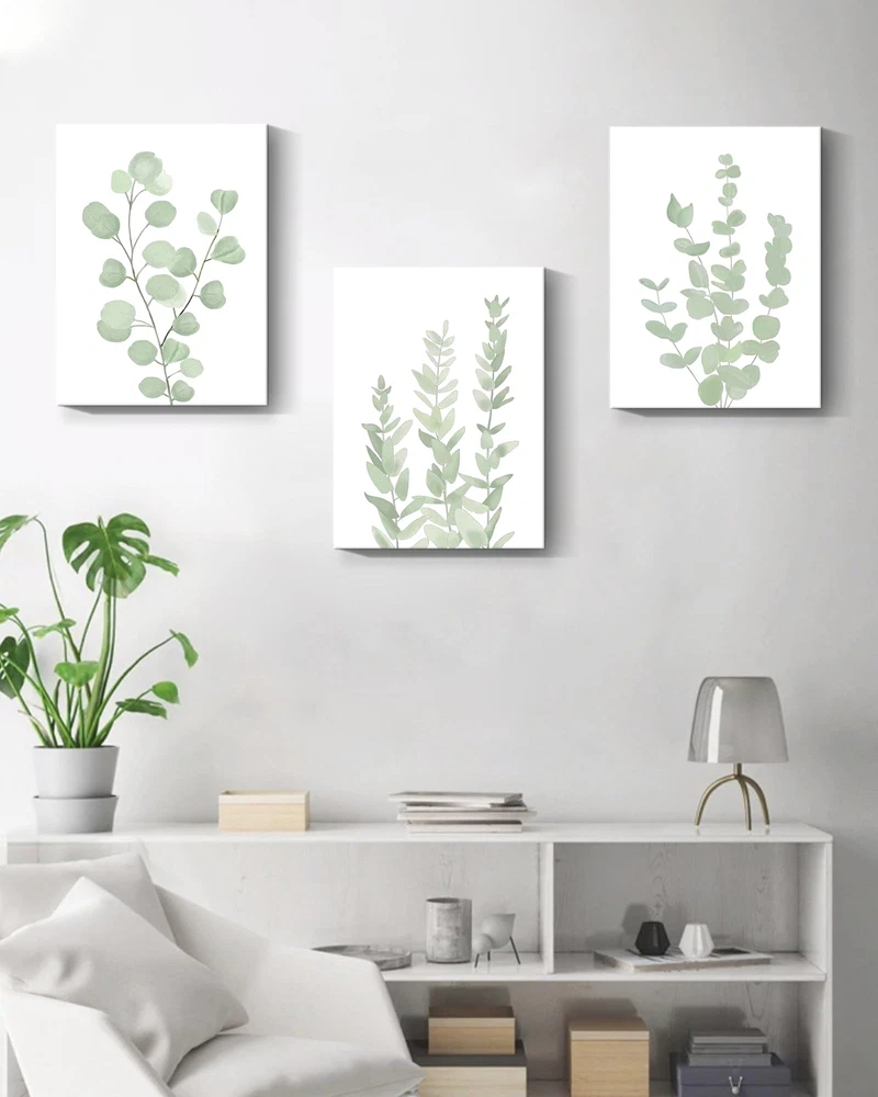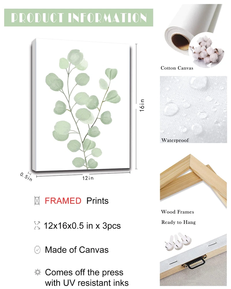 [BOTANICAL WALL ART] - Botanical art is a popular style of modern interior design. This Eucalyptus plant wall art can bring fresh and fashionable elements to your room. While appreciating its unique beauty, it can also bring you calming.It will be the perfect choice for wall decor in anyone's room ! [READY TO HANG] - 12”x 16”x 0.5”, Set of 3, The botanical wall painting already stretched on dry timber frame which is stable and light weight. Also, the hook already mounted on the wooden bar for easy hanging out of box. [CLEAR PRINTING] - Canvas paintings are smooth and elastic, thick and wrinkle-resistant, waterproof and fade-resistant. Definition printing on the surface makes the pattern more vivid and life like; no one will miss your room wall art! No matter if it is kids room decor or room decorations for adults, this Botanical wall art is perfect! [PERFECT ART APPRECIATION] - Beautify and enhance the sense of grade of home decoration. Botanical wall art for bedroom, plant wall decor for living room, minimalist prints for office, boho plant painting for bedroom, eucalyptus leaf picture for bathroom, etc. [GREAT CHOICE] - Botanical wall art can bring you inspiration and creativity. You can give it to your family, friends or other people you care about. These are very suitable and can be part of an elegant interior decoration.