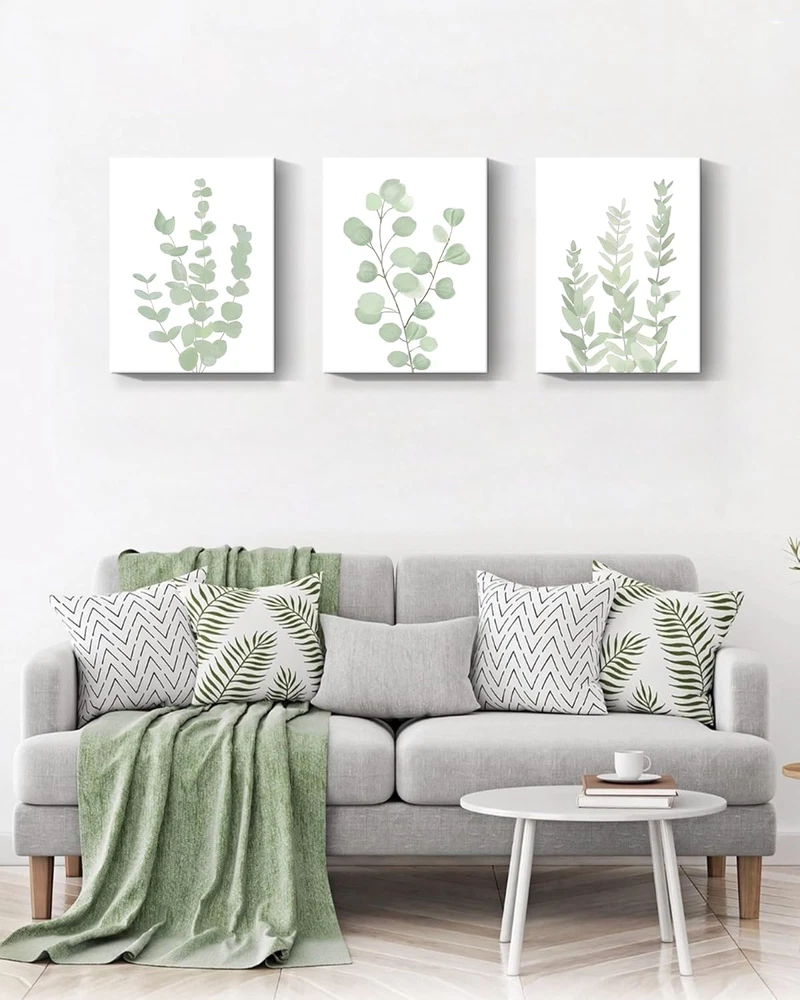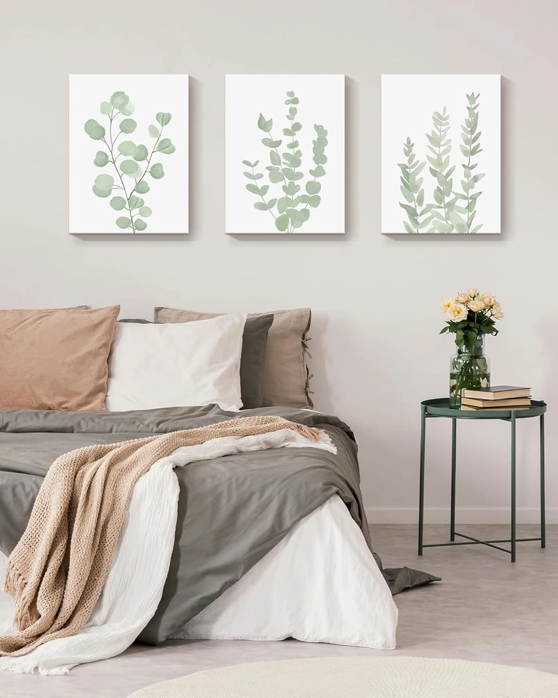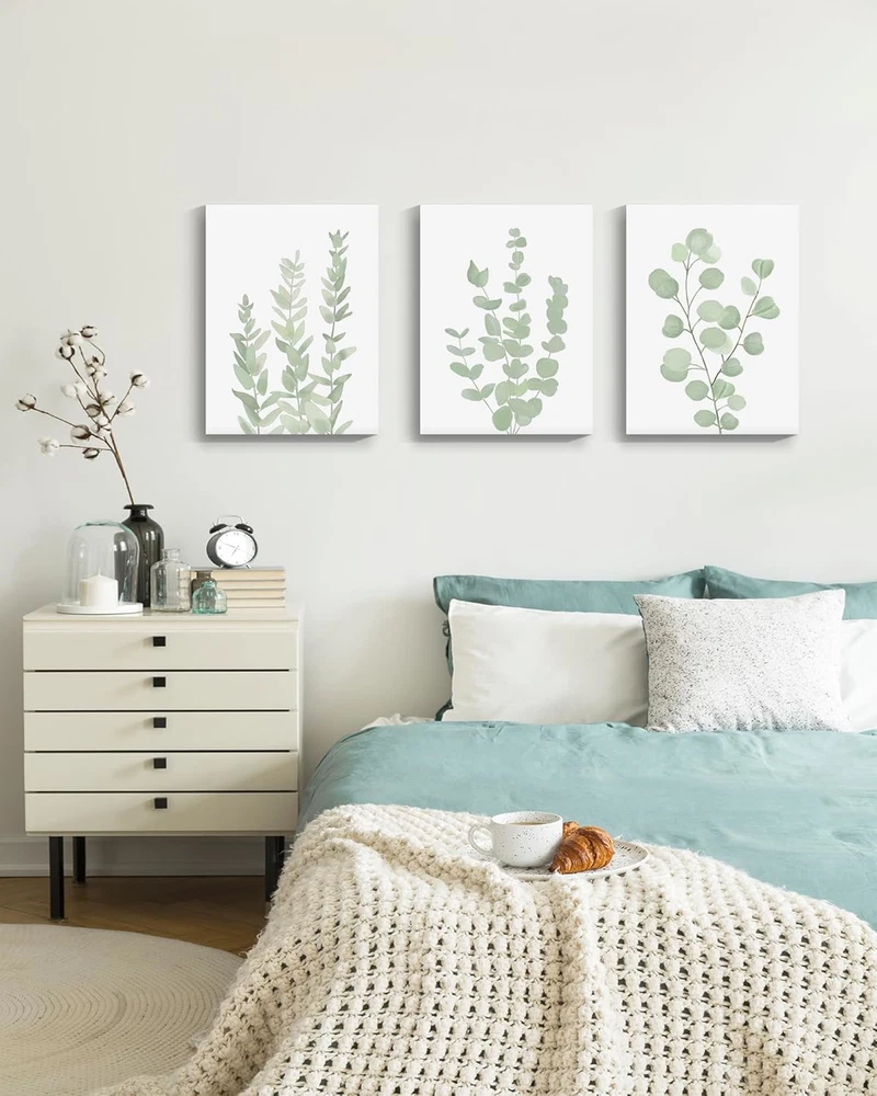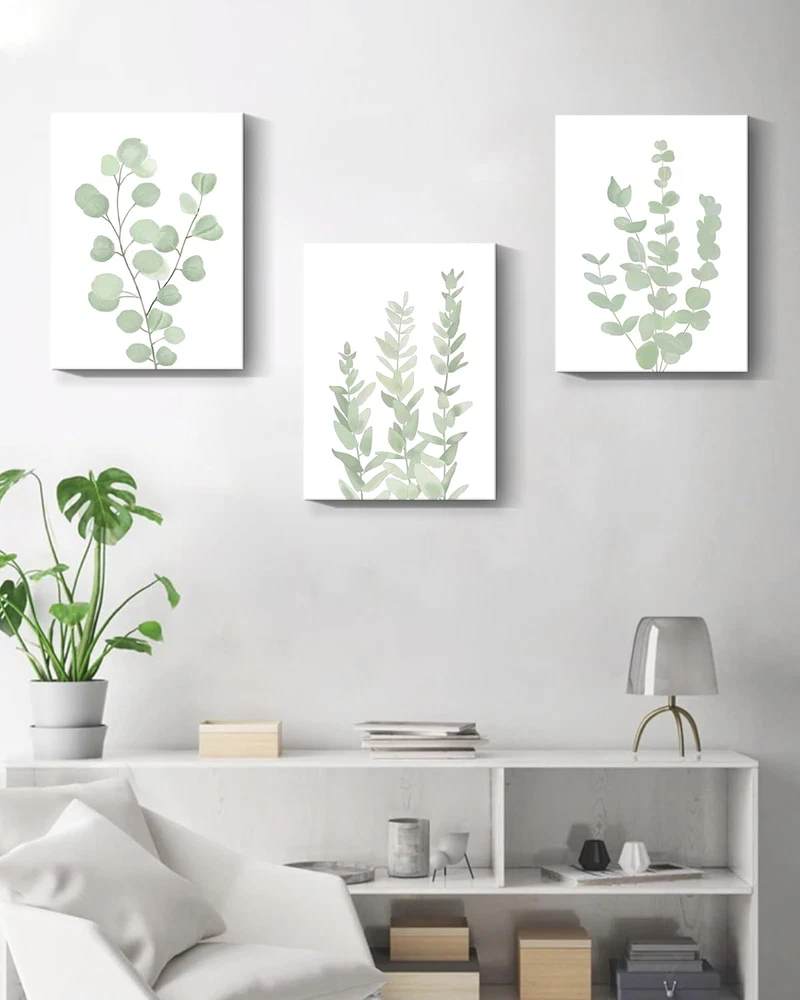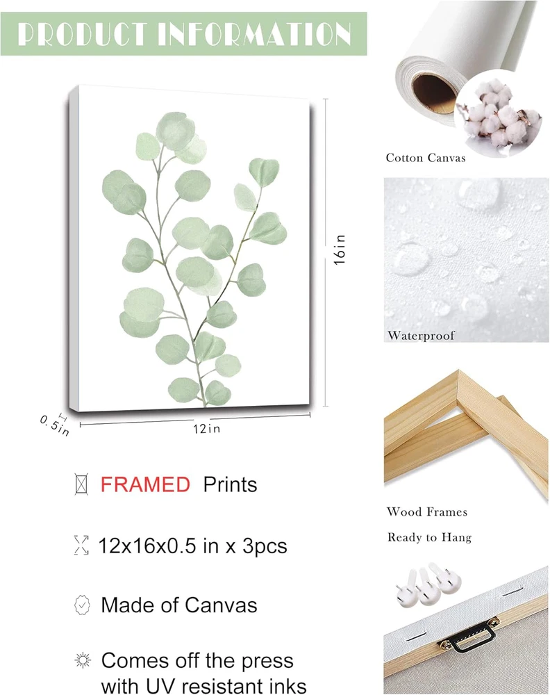 [BOTANICAL WALL ART] - Botanical art is a popular style of modern interior design. This Eucalyptus plant wall art can bring fresh and fashionable elements to your room. While appreciating its unique beauty, it can also bring you calming.It will be the perfect choice for wall decor in anyone's room ! [READY TO HANG] - 12???x 16???x 0.5???, Set of 3, The botanical wall painting already stretched on dry timber frame which is stable and light weight. Also, the hook already mounted on the wooden bar for easy hanging out of box. [PERFECT ART APPRECIATION] - Beautify and enhance the sense of grade of home decoration. Botanical wall art for bedroom, plant wall decor for living room, minimalist prints for office, boho plant painting for bedroom, eucalyptus leaf picture for bathroom, etc. [CLEAR PRINTING] - Canvas paintings are smooth and elastic, thick and wrinkle-resistant, waterproof and fade-resistant. Definition printing on the surface makes the pattern more vivid and life like; no one will miss your room wall art! No matter if it is kids room decor or room decorations for adults, this Botanical wall art is perfect! [GREAT CHOICE] - Botanical wall art can bring you inspiration and creativity. You can give it to your family, friends or other people you care about. These are very suitable and can be part of an elegant interior decoration.