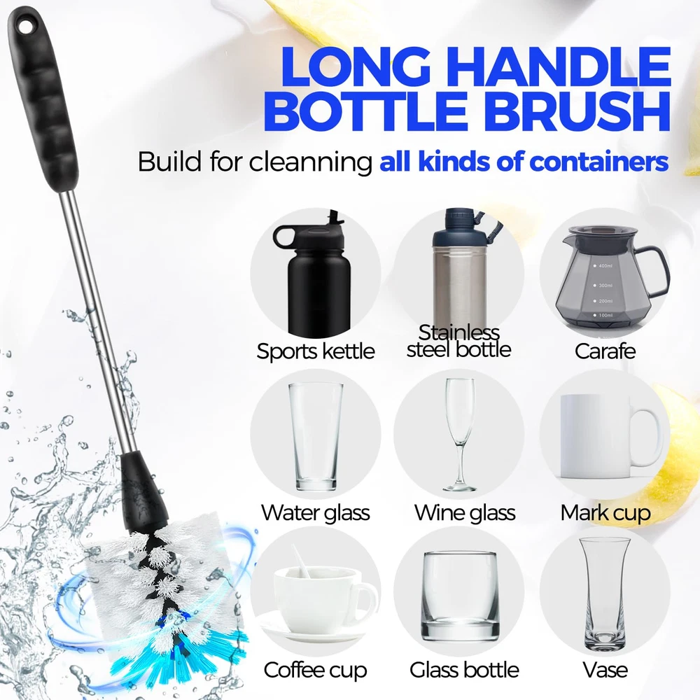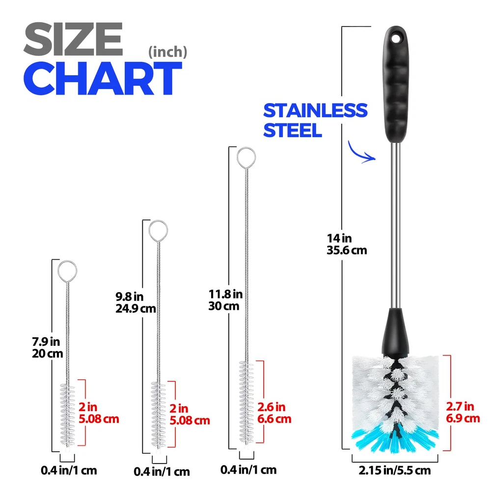 【4 PACK BOTTLE BRUSH SET】Includes 14" bottle brushes with stainless handle, 3×straw brushes. With this complete set of cleaning tools, you'll have everything you need to keep your drinkware sparkling clean and ready to use. 【BOTTLE BRUSHES WITH LONG STANINLESS】Measures 14" and non-scratch and odorless nylon bristle (soft black for gentle cleaning, stiff grey for serious scrubbing) easily removes stubborn stains from your bottles, carafes, travel mugs, containers etc. Its sturdy construction make tough cleaning tasks a breeze. With the non-slip rubber grip of this bottle scrub brush, you can clean your bottles with ease and comfort. 【3 STRAW BRUSHES】Varying lengths 7.9", 9.8", 11.8" and a diameter of 0.4". Designed to cater to different straw types, such as metal, plastic, and straw lids. Keep your straws clean, hygienic and debris-free, whether reusable or disposable. 【Safe and Hygienic Usage】This bottle brush set is made from food-grade polypropylene, ensuring it doesn't produce any peculiar odors. It is considered safe for your children and is a fantastic addition to your kitchen or a great gift option. You can easily store it in a kitchen caddy or hang it by its handle from a hook. Plus, it is dishwasher safe for added convenience. 【Powerful Cleaning Performance】Experience unmatched cleaning power, as our bottle cleaning brush efficiently tackles residue and grime, ensuring a spotless finish every time.