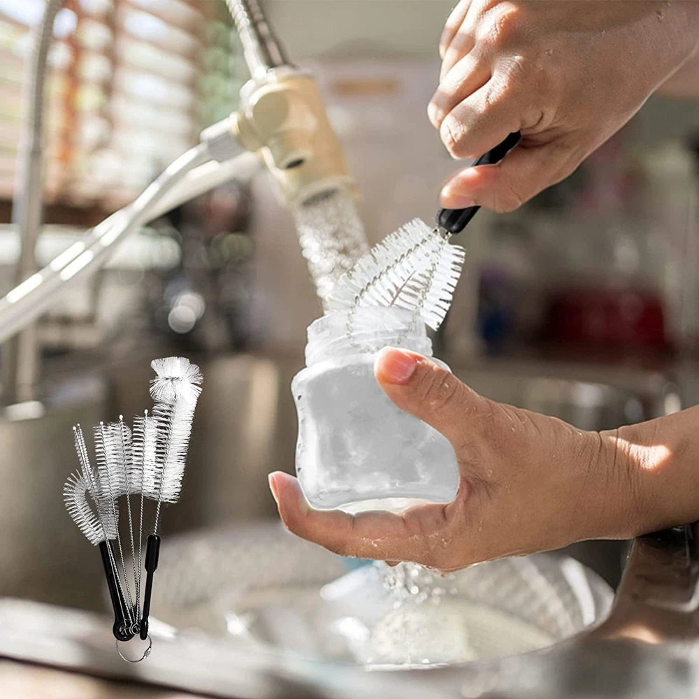 【Assortment】 bottle cleaning brush kit includes 1 pcs 12in water bottle cleaning brush, 1 pcs 360-degree clean lid brush and 5 pcs straw cleaner brushes in different sizes. Total 7 pcs are chained together with a keychain.baby bottle cleaner set help you with a true 360-degree cleaning 【High Quality and Durable】 bottle scrubber brushes is made of hard nylon bristles and rust-resistant stainless steel, which is easy to clean and does not rust and lint. The top of the metal straw cleaner brush has a scratch-resistant design. Last but not least, the handle of the bottle brush is sturdy and easy to grip 【Bendable Deformability】 stainless steel straw cleaner brush extra long is deformable and can be bent into any shape, it also holds the curved shape well, so bottle brushes long handle are easy to enter any hard-to-reach space, from this set of water bottle brushes for cleaning you will always find the right tool to clean crevices and hard to reach corners 【Widely Use】 If you need a bottle cleaner set to clean your favorite water bottle, ours will do it.bottle brush set is suitable for many kinds of tube cleaning, for bottle, wine/ beer bottles, baby bottle cleaner, straw, narrow and wide-neck pipe, mason jars,teapot, coffee machine and pot, hookah, flower vases,sink drain, weed smoking bong, hummingbird feeder, computer keyboard 【Customer Satisfaction】 Contact us if you have questions or concerns about your pack of water and baby bottle cleaner brushes.Our team is always available and happy to help