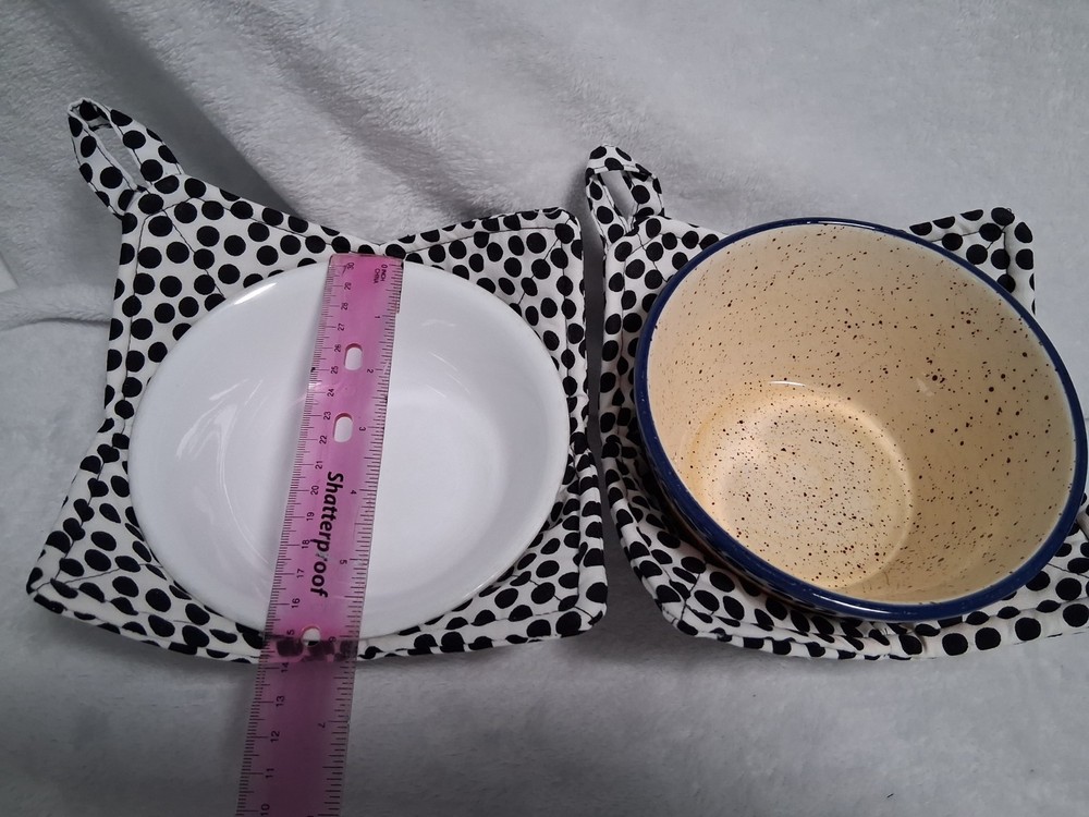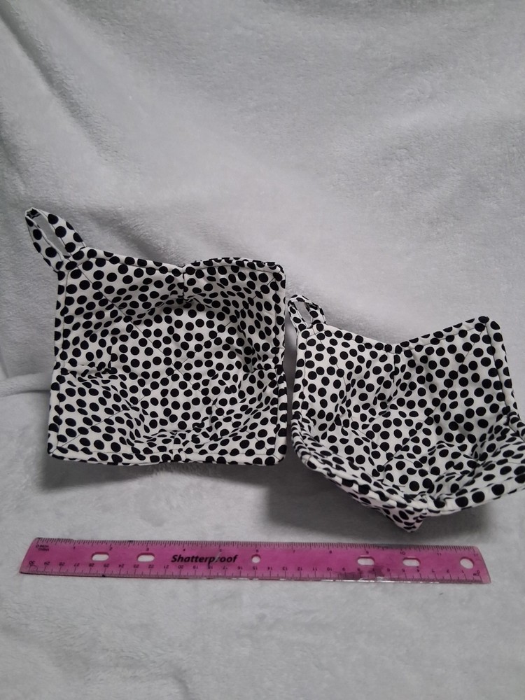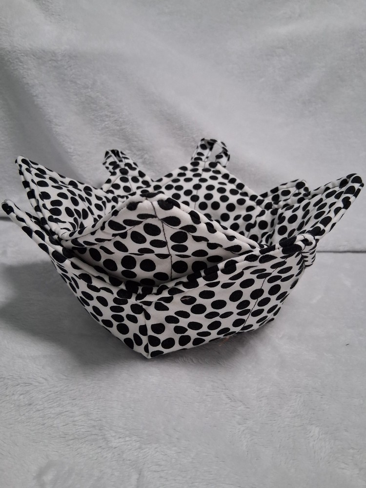 This set of 2 polka dot bowl cozys in black and white features hanging loops for easy storage. Made from 100% cotton, these handmade bowl cozys are perfect for protecting your hands and table from hot dishes and adding a touch of charm to your kitchen décor. Machine washable up to 85°F, they are suitable for various occasions and can be used by both children and adults. Perfect for adding a fun and whimsical touch to your kitchen, these bowl cozys are a must-have for any home cook looking to stylishly protect their table.