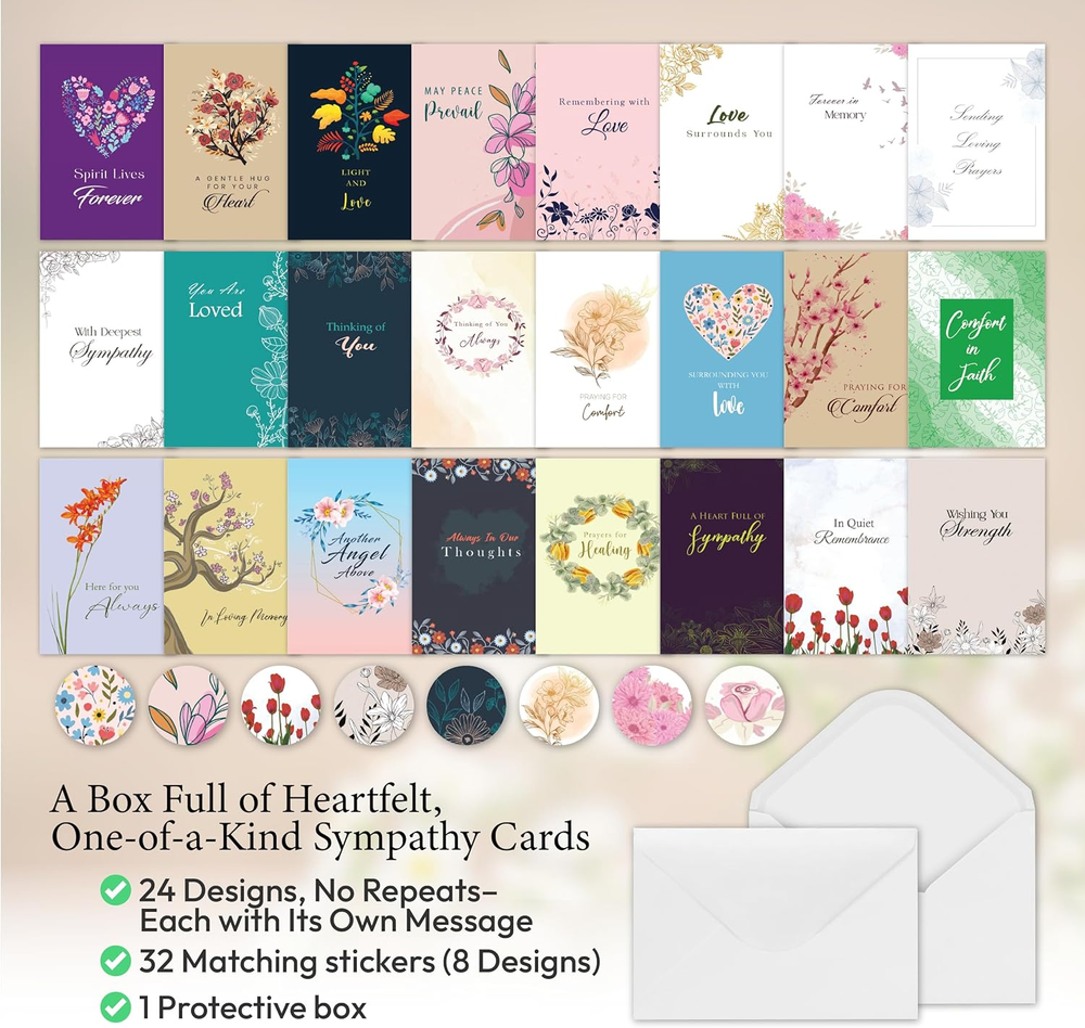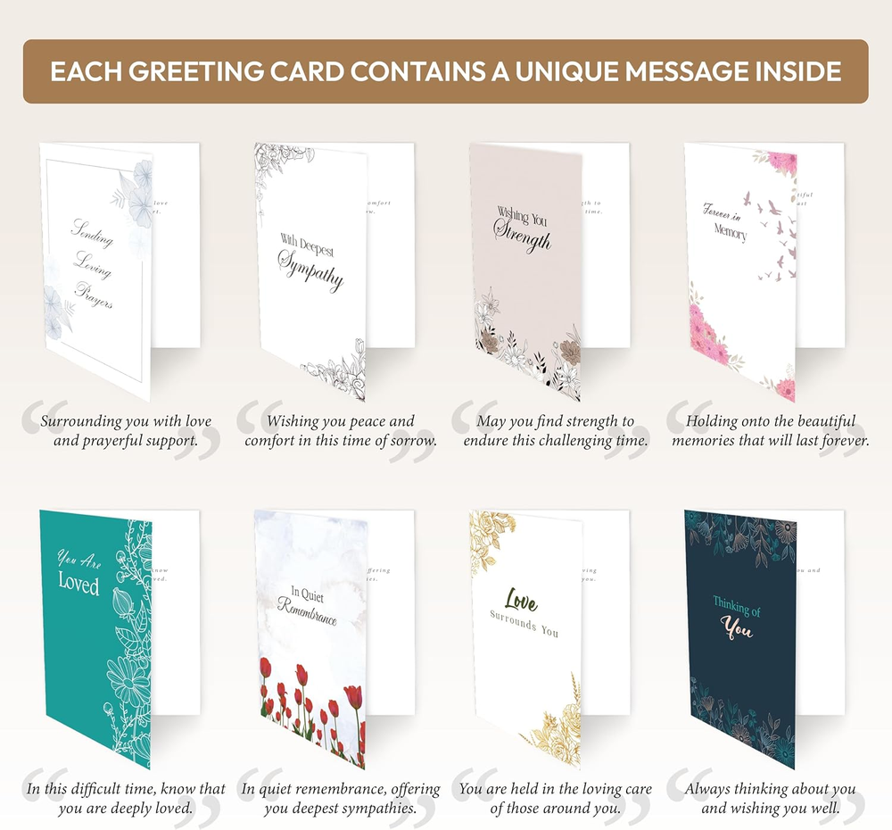 Fast Shipping On All Items 30 Days Money Guarantee Customer Support Excellent Service 100% Satisfaction Satisfaction Guaranteed Box of Sympathy Cards with Envelopes, 24 Pack Condolence Card for Bereavement, L Specification Item model number OZ158B Number of Items 24 Color Unique Manufacturer Part Number OZ158B Item Weight 11.2 ounces Pre-printed Blank Inside Product Dimensions 6 x 4 x 0.04 inches Size 4 X 6 Inches 4.0 inches x 6.0 inches x 0.04 inches. Weight: 11.2 oz Item Description Meaningful Messages for Every Loss: With sentiments like “Thinking of You,” “A Gentle Hug for Your Heart,” and “Spirit Lives Forever,” each card offers a different way to express heartfelt sympathy and support. Floral Artwork That Comforts: The set features 24 unique designs with soft florals, elegant leaves, and gentle nature themes, each one carefully created to convey peace and beauty during difficult moments. Complete Sympathy Set with Extras: Includes 24 cards, matching white envelopes, and round floral sealing stickers, so every message arrives polished and ready to send with care. For Any Relationship or Occasion: Whether you're supporting a friend, family member, colleague, or neighbor, these cards are suitable for funerals, memorials, pet loss, miscarriage, or quiet expressions of comfort. Keepsake Storage Box Included: The floral-themed storage box keeps your cards, envelopes, and stickers neatly organized and protected, always ready for when someone needs your support the most. Product description 1 Floral 2 Monochrome 3 Unique 1 Faith-Inspired Comfort 2 Keepsake-Worthy Messages 3 Elegant Storage Box Heartfelt Greetings for Every Life Moment Add to Cart Add to Cart Add to Cart Add to Cart Add to Cart Add to Cart Add to Cart Customer Reviews 4.6 out of 5 stars 63 4.6 out of 5 stars 63 4.6 out of 5 stars 63 4.8 out of 5 stars 76 4.7 out of 5 stars 101 4.6 out of 5 stars 32 4.4 out of 5 stars 143 Price $9.99 $ 9 . 99 $12.99 $ 12 . 99 $8.99 $ 8 . 99 $9.99 $ 9 . 99 $9.99 $ 9 . 99 $7.99 $ 7 . 99 $14.99 $ 14 . 99 How many sets? 24 Cards 24 Cards 24 Cards 30 Cards 30 Cards 3 Cards 50 Cards How many unique designs? 6 Designs 24 Designs 6 Designs 10 Designs 5 Designs 3 Designs 10 Designs Size 4" x 6" 4" x 6" 4" x 6" 4" x 6" 4" x 6" 5" x 7" 4 in x 6 in Inside Short Generic Message Short Generic Message Short Generic Message Blank Inside Blank Inside Blank Inside Blank Inside Occasions Loss of loved ones, Grieving Memorial Service or FuneraL Bereavement All Occasions All Occasions Moment of Recovery All Occasions Suitable For Mother, Father, Husband Friends, Coworker Wife, Family Family, Friends, Co-worker Teacher, Business, Men Women, Men Kids, Students, Businesses About us We offer the best prices around on high quality products. Our E-store includes media such as books, movies, music and games while offering electronics, toys, sporting apparel, clothing, tools, general home, garden items and more. Shipping We are always working hard to ensure your package arrives as soon as possible. Please understand that some factors like weather, high postal traffic, and the performance of shipping companies are outside of our control. We offer free shipping to the lower 48 states and ship within 2-3 business days of payment, usually sooner. We do not accept P.O. Boxes. Please provide a physical address. For shipping outside of the continental USA, we only use eBay's Global Shipping Program.The item is shipped to KY and then sent to the rest of the world. International customers are responsible for all duties and taxes. Continue to check out to calculate costs for shipping the item to your country. Messages regarding eBay's Global Shipping Program MUST be directed at eBay EXCLUSIVELY. Returns We offer a 30-Day Return Policy on items in which you are not completely satisfied with. You have the option of a full-refund or an exchange of the item. No returns are available on items shipped outside of the USA Satisfaction We try over very best to make sure every customer is completely satisfied. If there's a problem, message us! We're happy to help. Payment Options Shop With Confidence