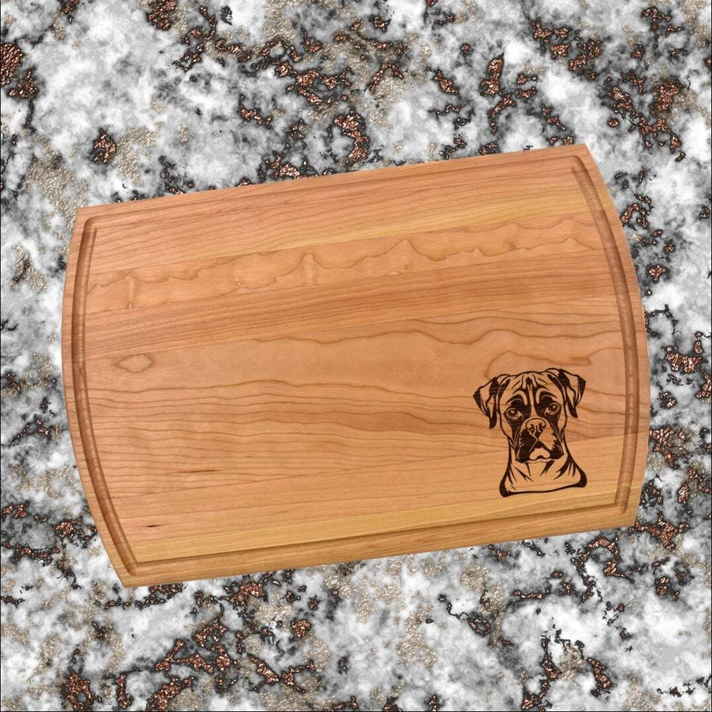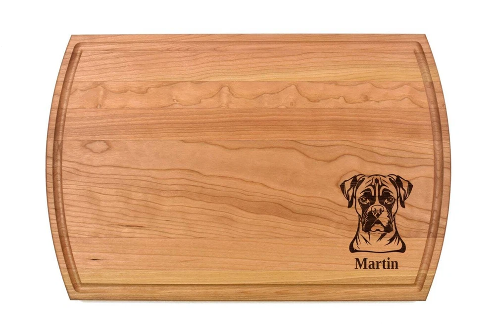 Design: Personalized Boxer Dog Cutting Board or Charcuterie Serving Tray All items ship via USPS - please make sure your address is correct :-) Whether used as a charcuterie serving tray for snacks or cutting board, our bamboo, walnut and cherry custom boards are the perfect addition for the home and make the perfect gift for your loved one celebrating a birthday, anniversary, new home, wedding, etc! *** FEATURES *** • SIZES: We have multiple styles and sizes available. To see our current sizes available, click the drop-down menu. The photo slide contains a photo showing each side by side. Please note, the board with the juice groove only has the groove on the front side of the board. • THICKNESS: Bamboo Boards - Approximately 1/2" Thick; Walnut & Cherry Boards - Approximately 3/4” Thick • UNIQUE: Every board is unique with the grain and coloring varying throughout - no board is the same! • CARE INSTRUCTIONS: Hand wash only with warm water. Do not soak. Please apply mineral oil throughout the board’s life. • PERSONALIZATION/CUSTIMIZATION: Do you want the text placed differently on the board? Please don’t hesitate to contact us. All personalization notes can be entered in the personalization box when checking out. • SHIPPING: All cutting boards ship within 2 to 5 business days. • WHOLESALE ORDERS: Please don’t hesitate to contact us for information about wholesale orders. Processing times for larger orders may change. • NOTE: Colors can vary a bit on different monitors and screens. Any props included in photos are not included. Please be sure to double-check your address to make sure it is accurate for USPS delivery. If a package is returned to us due to an invalid address, the buyer is responsible for all additional shipping charges. We appreciate you supporting small business – best wishes! For items ordered with simple edits, we do not send proofs since the layout doesn't change from the example(s). However, in the event there are requests that change the layout from the example(s), we do send proofs for approval before making the product. If you'd like a proof before we make the product, please note so in the personalization box.