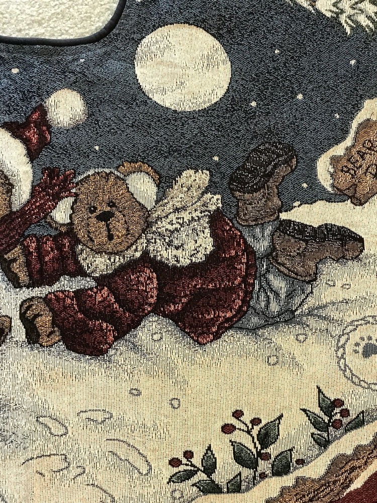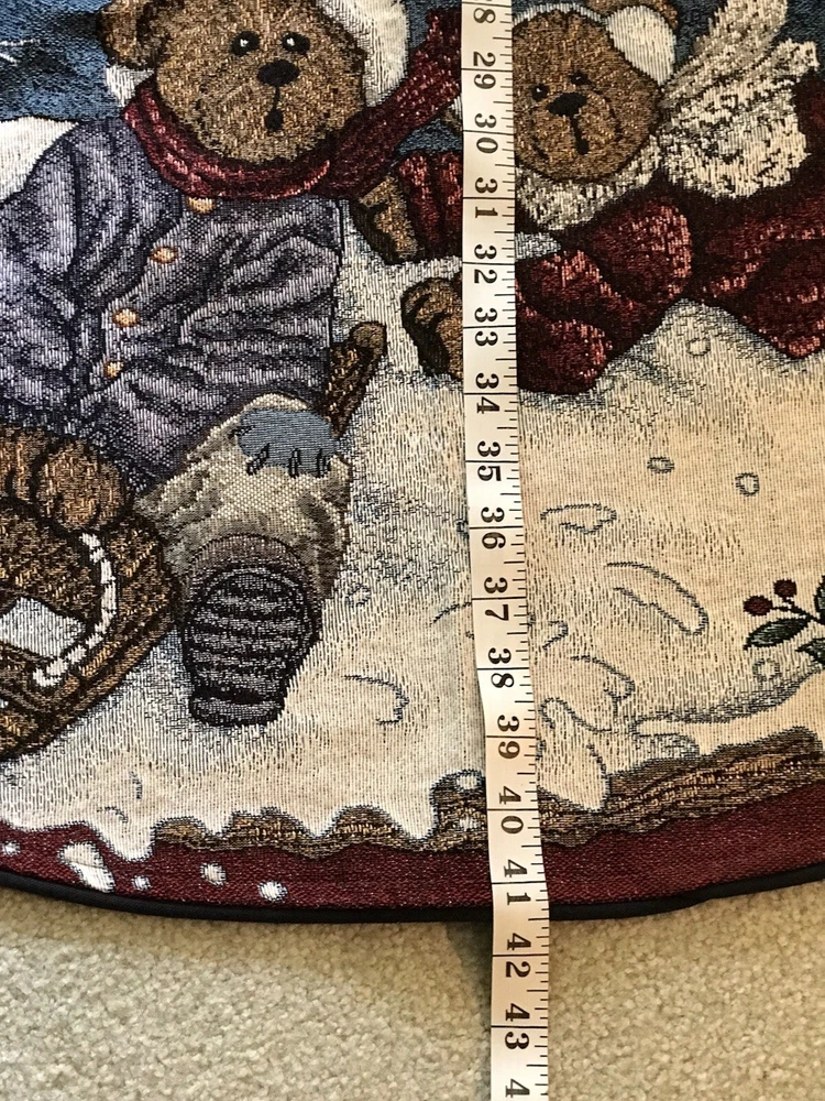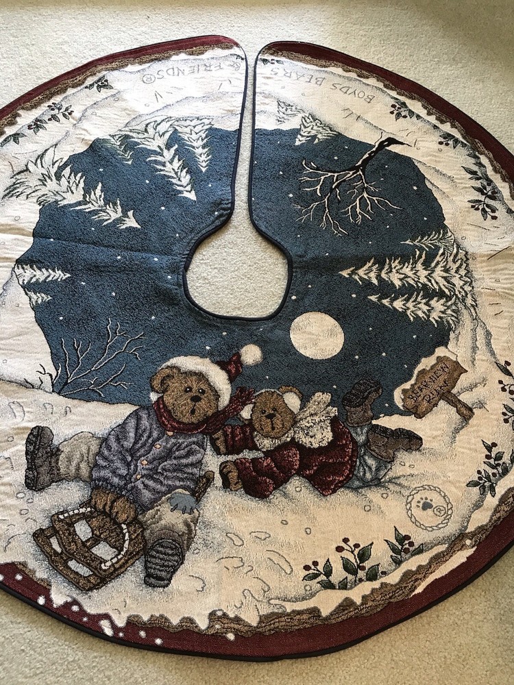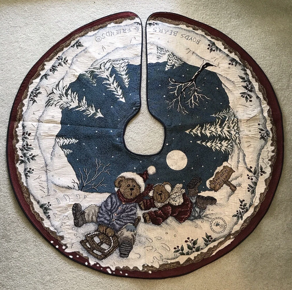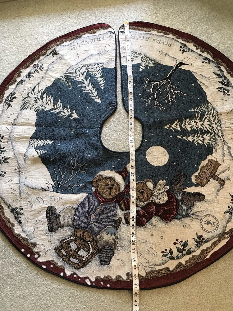 *** Very minimal sown repair on the edge piping. See the last 2 photos for the example. Very slight. Barely noticeable. **** The Boyds Bears Tapestry Christmas Tree Skirt featuring the scene "Enjoy the Ride" with snow sledding, is a large circle-shaped decor made of polyester, cotton, and acrylic materials. This multicolor tree skirt by Boyds Bears is perfect for holiday celebrations, adding a festive touch to your Christmas tree. The tapestry design and holiday theme make it a charming addition to your seasonal décor, while the high-quality materials ensure durability and longevity in your home. In a smoke free home.