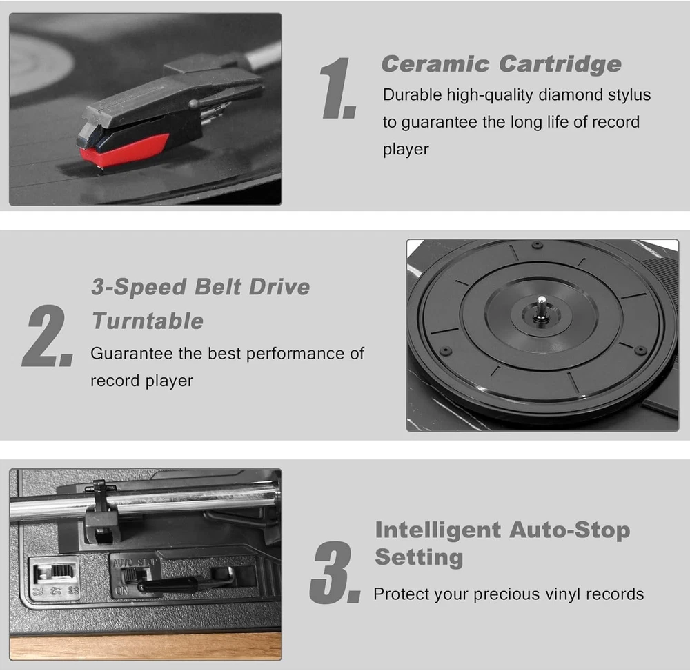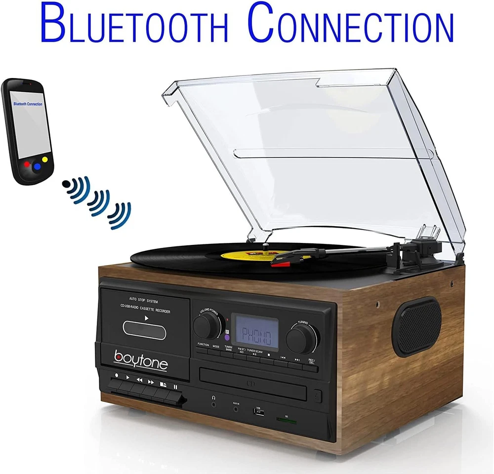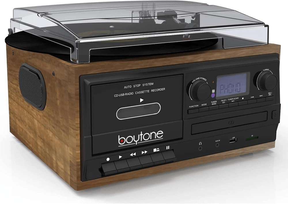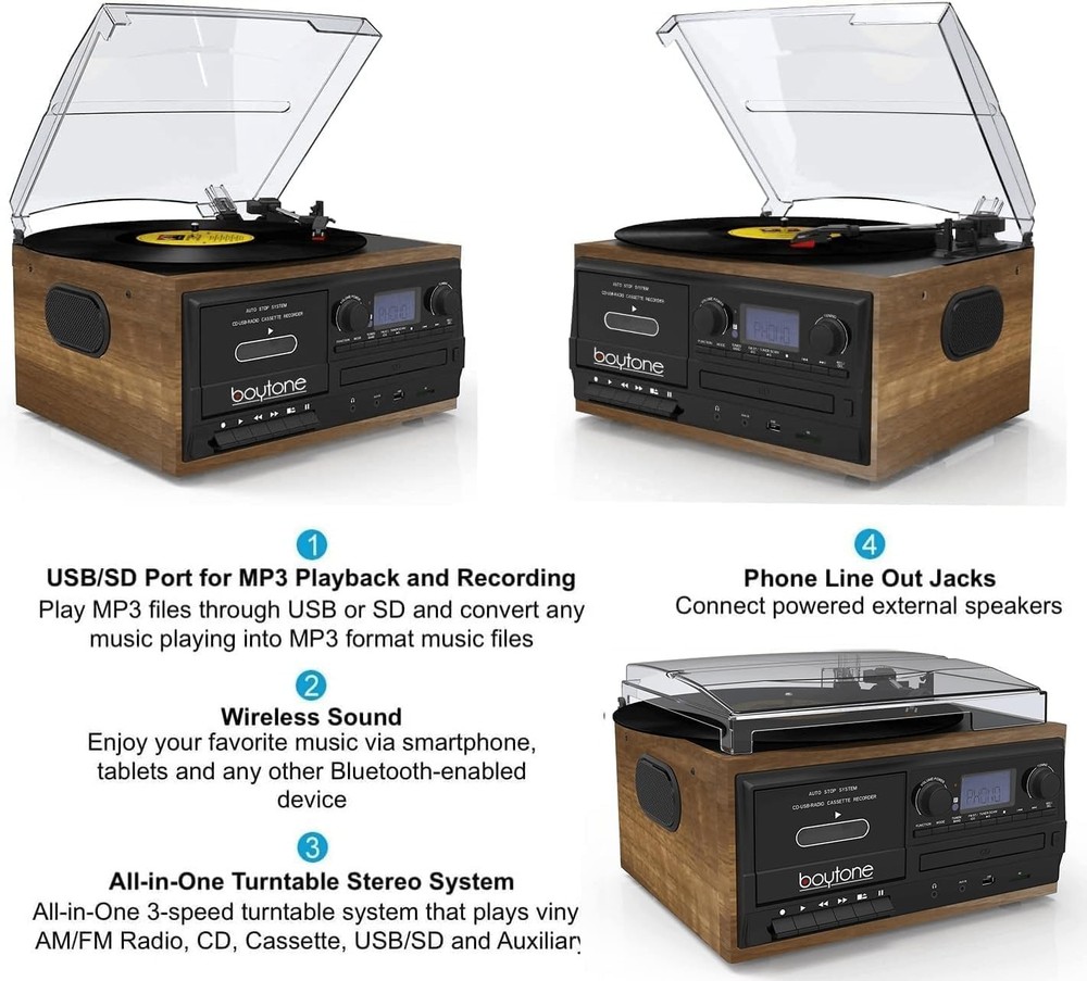 Boytone BT-32W Bluetooth Classic Record Player Turntable All-in-One Walnut Product Details Package Dimensions: 14.57 x 13.78 x 10.63 inches Item Weight: 9 pounds Item model number: BT-32W Manufacturer: Boytone Brand: Boytone Connectivity Technology: SD, Bluetooth, Auxiliary, USB Included Components: Dust cover, 45 RPM adapter Material: Plastic Item Weight: 9 Pounds Style: Modern, classic Color: Walnut Model Name: BT-32W Compatible Devices: Headphone, Speaker Motor Type: AC Motor RICH AUDIO EXPERIENCE: Enjoy a stereo system for home with turntable that combines classic vinyl play with modern connectivity. Features high-quality external speakers that enhance every note and beat VERSATILE LISTENING OPTIONS: This 3-Speed Record Player Turntable not only spins vinyl at 33 1/3, 45 and 78 RPM, but also includes a CD player, cassette deck, and AM/FM radio, offering comprehensive media functionality STREAM YOUR FAVORITES: Equipped with Bluetooth technology, allowing you to stream music seamlessly from devices to your stereo system with turntable ALL-IN-ONE MUSIC CENTER: Acts as a complete stereo system for home, offering multiple ways to enjoy your favorite audio, from Turntable for Vinyl Records to MP3 conversions via USB CLASSIC DESIGN WITH CONTEMPORARY FEATURES: Blends the timeless charm of a classic turntable with the latest audio technologies, ensuring durability, style, and high-fidelity sound