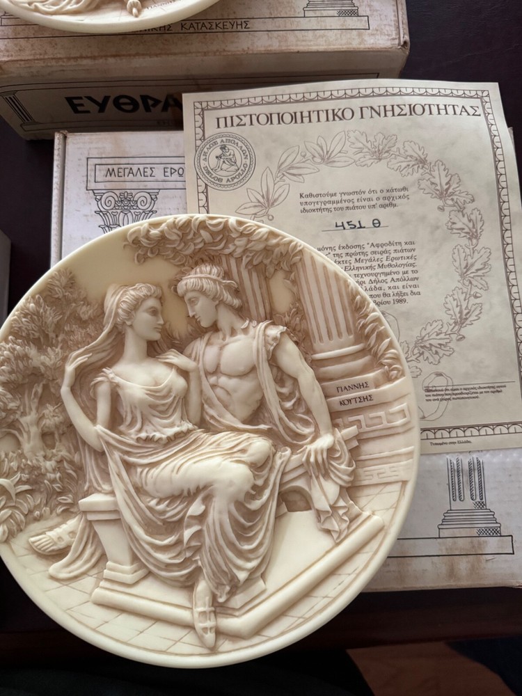 Absolutely stunning set of collector plates! The intricate Greek-inspired designs and elegant beige tones make them a perfect display piece. The marble-like material adds a touch of classic sophistication, and the 1980s art pottery vibe gives them a unique charm. A must-have for collectors who appreciate timeless craftsmanship and cultural artistry. Love how they elevate any space!