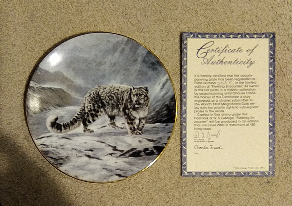 The product is a vintage collector plate from Bradford Exchange featuring a snow leopard design from the "World's Most Magnificent Cats" series. Made of ceramic, the round plate has a diameter of 8.5 inches and comes with a stand. With a decorative style and themes of cats, this collector plate is part of an art pottery production style and was manufactured in the late 20th century, specifically in the 1990s. This multicolored plate is perfect for all occasions and adds a touch of American culture to any collection of decorative collectibles. You Will Receive The Item(s) Pictured. We Do COMBINE SHIPPING So Take A Look At Our Other Items. If You Would Like To Take Advantage Of The COMBINED SHIPPING Please Wait For Invoice Before Payment. If You Have Any Questions We Will Be Happy To Answer Them.