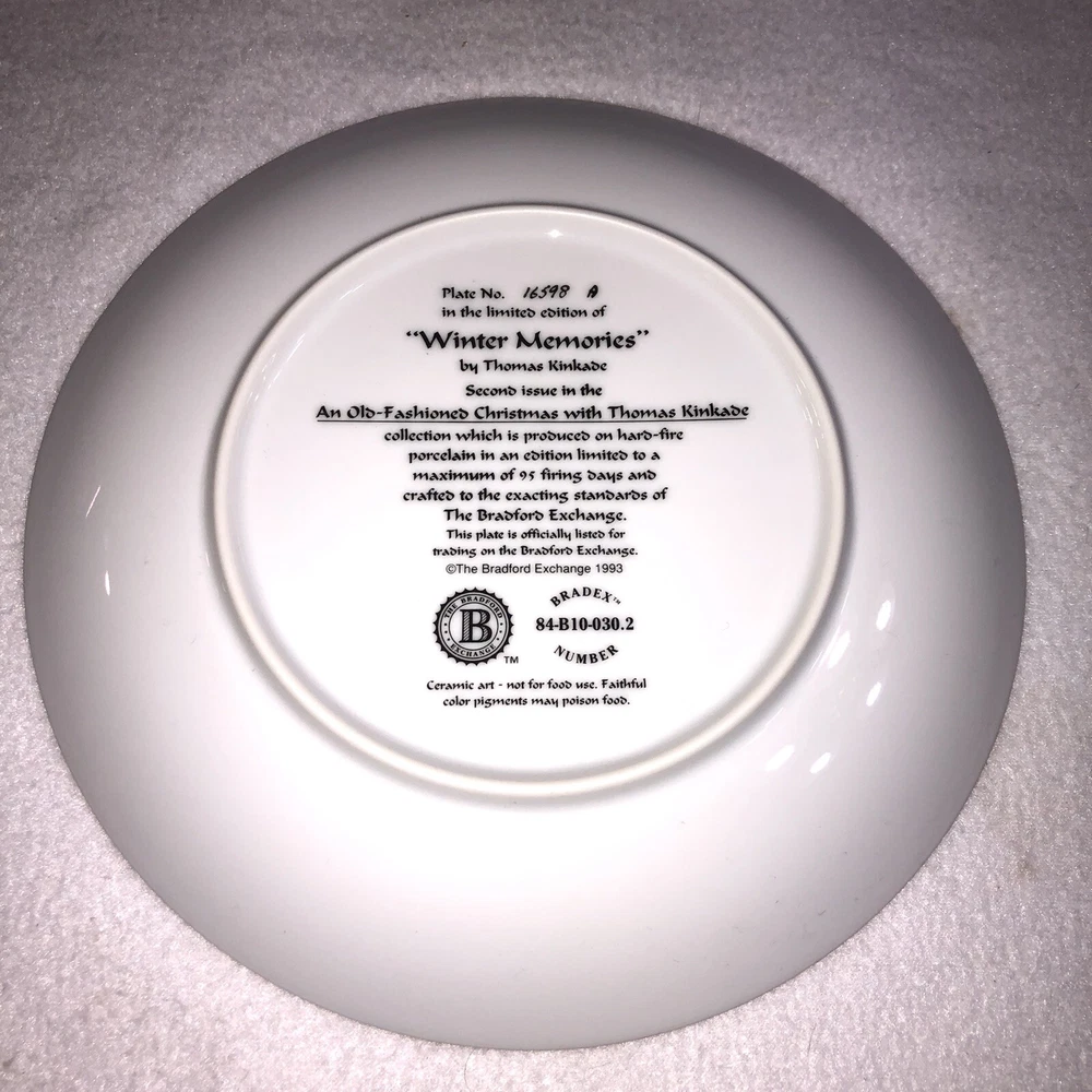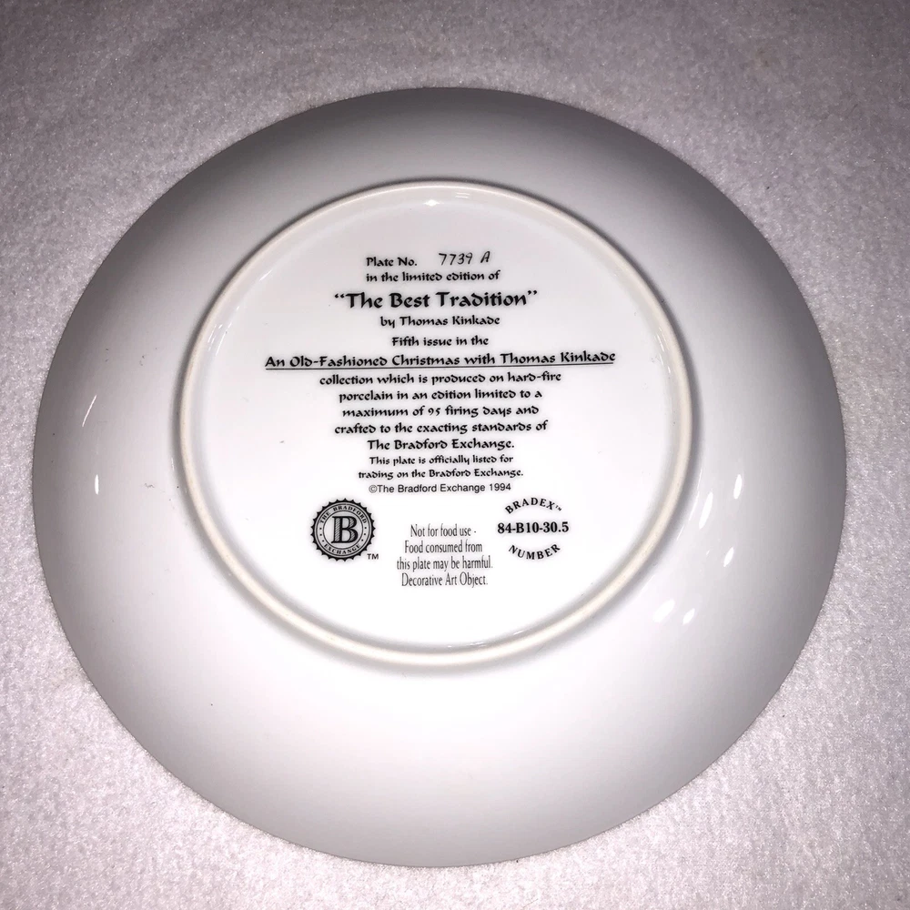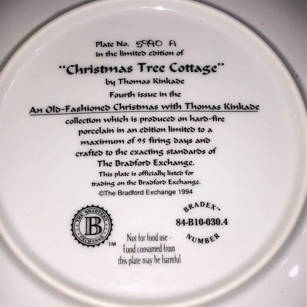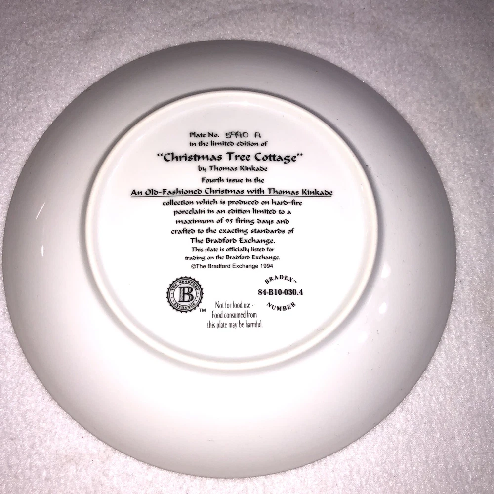 This is a stunning lot of 4 Bradford Exchange decorative plates by Thomas Kinkade. These plates are from his "An Old Fashioned Christmas" series. They date from 1993 and 1994. Included in the lot are: -1993 All Friends Are Welcome, the first issue in the series. The plate is numbered 10236E and has a BRADEX NUMBER of 84-B10-030.1 - 1993 Winter Memories, the second issue in the series. The plate is numbered 16598A and has a BRADEX NUMBER of 84-B10-030.2 -1994 Christmas Tree Cottage, the fourth issue in the series. The plate is numbered 5990A and has a BRADEX NUMBER of 84-B10-030.4 - 1994 The Best Tradition, the fifth issue in the series. The plate is numbered 7739A and has a BRADEX NUMBER of 84-B10-030.5 The plates are edged in a gold trim and measure approximately 8 inches. They are in good vintage pre-owned condition. There are no nicks, chips, cracks or repairs. Gold trim shows little to no wear. These no longer include their original boxes or certificates. This is a plates only listing. Please review and enlarge all photos for additional details, views and measurements. Shipped via USPS Ground Advantage.