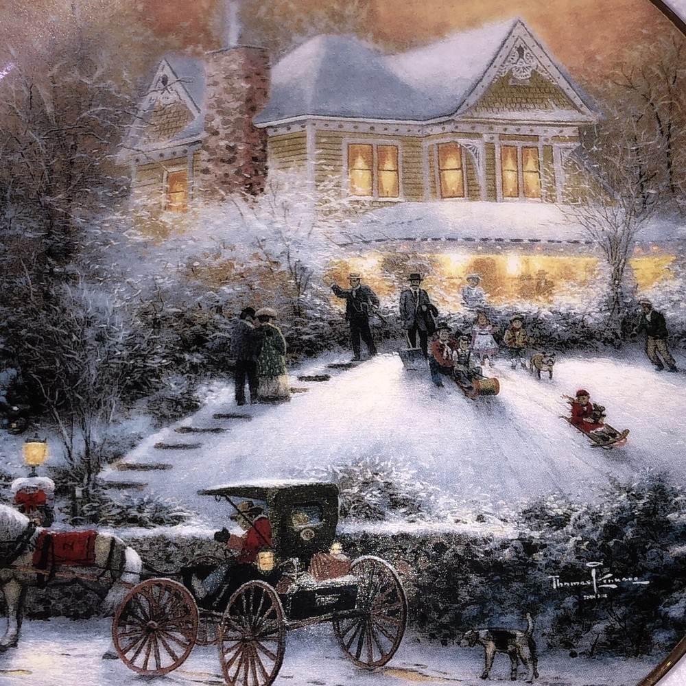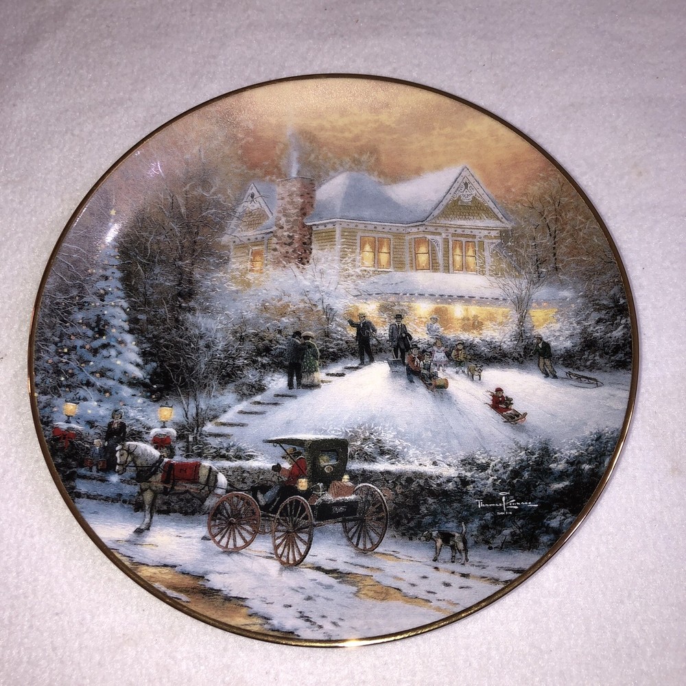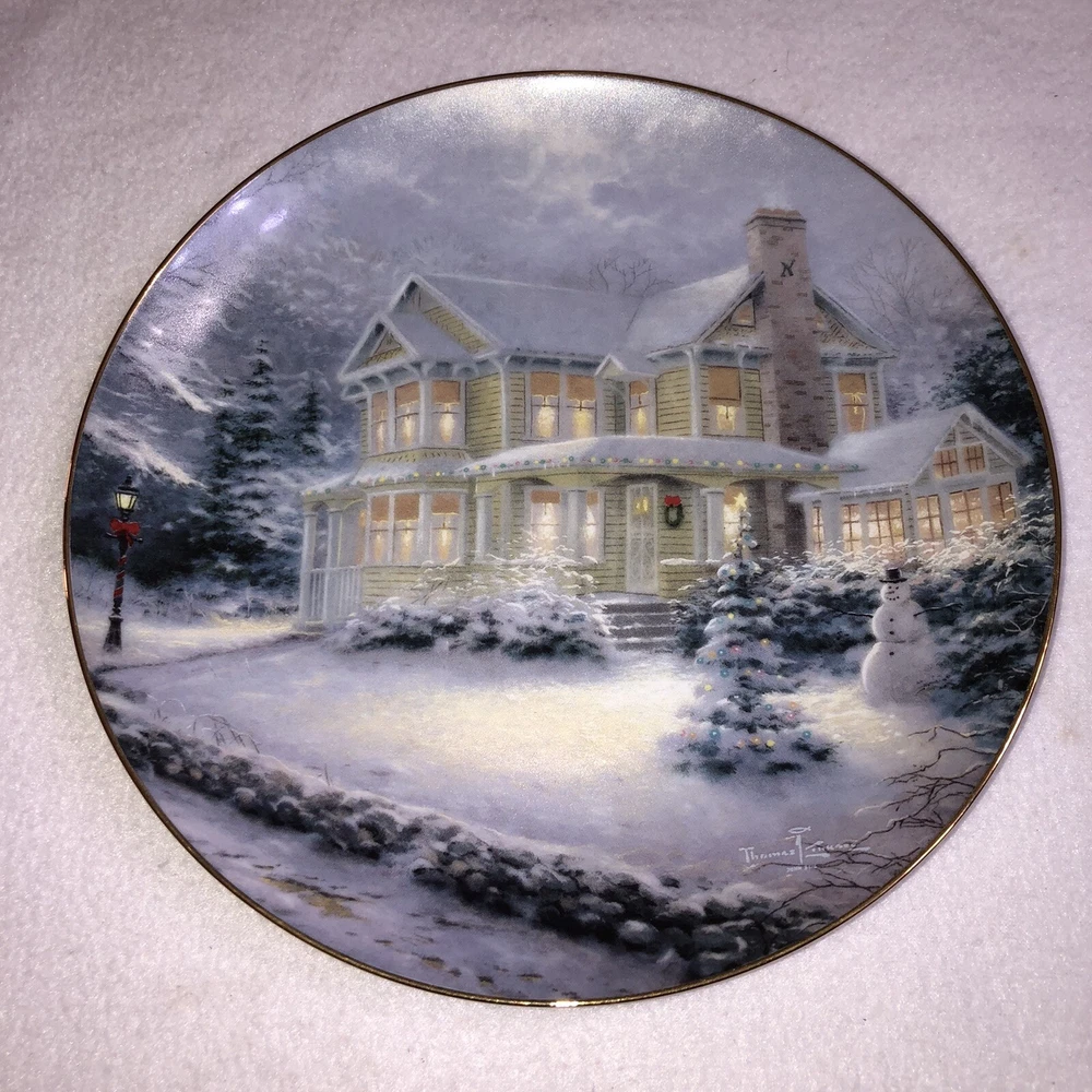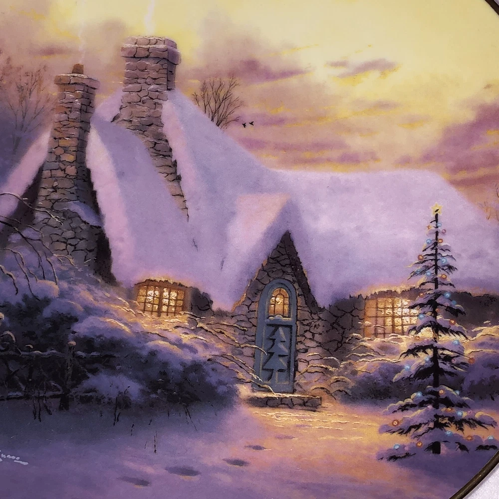 This is a stunning lot of 4 Bradford Exchange decorative plates by Thomas Kinkade. These plates are from his "An Old Fashioned Christmas" series. They date from 1993 and 1994. Included in the lot are: -1993 All Friends Are Welcome, the first issue in the series. The plate is numbered 10236E and has a BRADEX NUMBER of 84-B10-030.1 - 1993 Winter Memories, the second issue in the series. The plate is numbered 16598A and has a BRADEX NUMBER of 84-B10-030.2 -1994 Christmas Tree Cottage, the fourth issue in the series. The plate is numbered 5990A and has a BRADEX NUMBER of 84-B10-030.4 - 1994 The Best Tradition, the fifth issue in the series. The plate is numbered 7739A and has a BRADEX NUMBER of 84-B10-030.5 The plates are edged in a gold trim and measure approximately 8 inches. They are in good vintage pre-owned condition. There are no nicks, chips, cracks or repairs. Gold trim shows little to no wear. These no longer include their original boxes or certificates. This is a plates only listing. Please review and enlarge all photos for additional details, views and measurements. Shipped via USPS Ground Advantage.