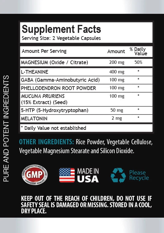 SUPERIOR SLEEP SUPPORT WITH L-THEANINE, PHELLODENDRON ROOT, GABA, MUCUNA PRURIENS, 5-HTP, MELATONIN Made in USA 2 Bottles 120 Capsules Sleep Support : Our SLEEP SUPPORT supplement has a superior formula to aid in healthy deep sleep. The natural ingredients that are included in the supplement are: Magnesium (Oxide/Citrate), L-Theanine, GABA (Gamma-Aminobutyric Acid), Phellodendron Root Powder, Mucuna Pruriens, 5-HTP, Melatonin. Brain Support: L-theanine, an amino acid found in green tea, reduces in the Brain while stimulating production of the inhibitory, relaxing GABA. L-theanine relieves stress in large part because it bears a close resemblance to the Brain-signaling compound glutamate. Studies suggest a potential role for L-theanine in supporting cognitive function and preventing its loss. Studies such as these demonstrate that L-theanine can specifically reduce the molecular impacts of acute stress on Brain cells. Sleep Support: GABA has a calming, sedative effect and may be able to help naturally induce sleep by reducing nerve excitability. Study found that taking GABA helped participants fall asleep quickly, shortening the amount of time it took to fall asleep by an average of five minutes. Besides using GABA for sleep, maintaining a regular sleep schedule, limiting your caffeine intake and taking magnesium to help promote GABA function can all also encourage better sleep. Emotional Support: In addition to preventing and regulating sleep, the GABA neurotransmitter is also thought to play a central role in emotional well-being. Research has found that people with emotional impairment tend to have lower levels of GABA than those without it. Mood swings also have been shown to be improved with GABA supplementation. Focus Enhancer: Increasing GABA production may result in an improvement in energy to maintain sharp focus. Short attention spans may be lengthened as increased GABA levels help with focus and concentrative ability. GABA’s benefits consist of an inhibitory effect on over-excitation within the Brain has a calming and soothing effect which contributes to a person’s sense of well-being. Athletic Support: Phellodendron along with other many ingredients in this supplement work together to help athletes rest and repair, ready to hit their workouts the next day. Recovery after the workout will be much more effective for the athlete since the ingredients aid in detoxifying the stresses put on the body and at the same time have calming and protective properties for the Brain. Sexual Support: Mucuna pruriens is an aphrodisiac, bolstering healthy sexual energy and libido. Mucuna also supports the proper functionality of both male and female reproductive organs. The natural ingredient works to increase natural Testosterone levels. Anti-Aging: The content of flavonoids in Mucuna Pruriens are also useful in stopping premature aging. Self-aging can occur because the skin is often exposed to air pollution and direct sunlight. The flavonoid will lift the dull skin and regenerate dead skin from these problems. In addition, flavonoid also protects and maintains skin health. Supplement Facts Serving Size: 2 Vegetable Capsules MAGNESIUM (Oxide / Citrate) 200 mg 50% L-THEANINE 400 mg * GABA (Gamma-Aminobutyric Acid) 100 mg * PHELLODENDRON ROOT POWDER 100 mg * MUCUNA PRURIENS (15% Extract) (Seed) 100 mg * 5-HTP (5-Hydroxytryptophan) 50 mg * MELATONIN 2 mg * OTHER INGREDIENTS: Rice Powder, Vegetable Cellulose, Vegetable Magnesium Stearate and Silicon Dioxide. SUGGESTED USE: 1 to 2 capsules taken at bedtime or as directed by a healthcare professional. FOR RELIEF OF OCCASIONAL SLEEPLESSNESS ONLY. CAUTION: Do not exceed the recommended dose. This product is not intended for pregnant or nursing mothers, children under the age of 18, or individuals taking any prescription medication including anti-depressants. Avoid driving or performing other potentially dangerous tasks while taking this formula. If you have questions about the advisability of taking this product, consult a physician prior to use. This product is manufactured and packaged in a facility which may also process milk, soy, wheat, egg, peanuts, tree nuts, fish and crustacean shellfish. *These statements have not been evaluated by the Food and Drug Administration. This product is not intended to diagnose, treat, cure or prevent any disease. PRIVATE LABEL SUPPLEMENTS