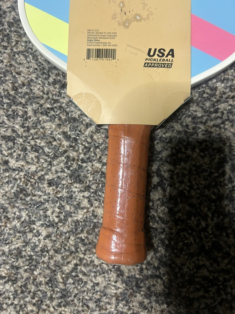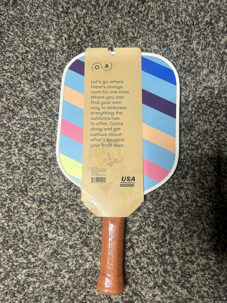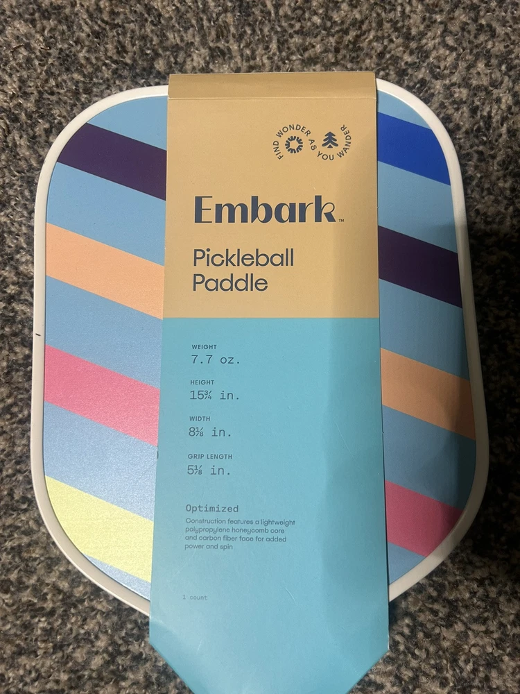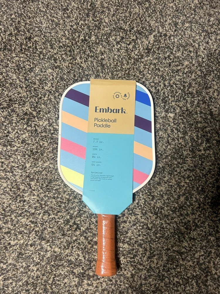 This is a brand new Embark pickleball paddle with a carbon stripe design. It weighs 7.7 oz and is suitable for unisex adults. The paddle is made in China and comes with four used pickleballs. The brand is Embark and the size type is regular. The department is unisex adults and the color is stripe. No refund check photos before buying