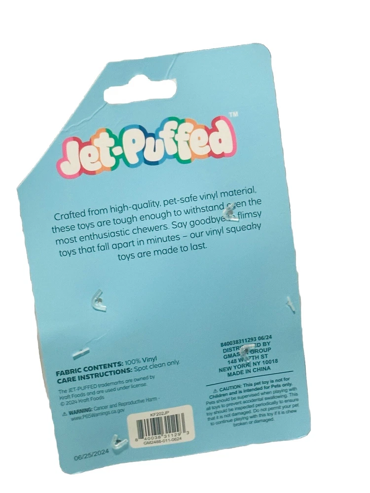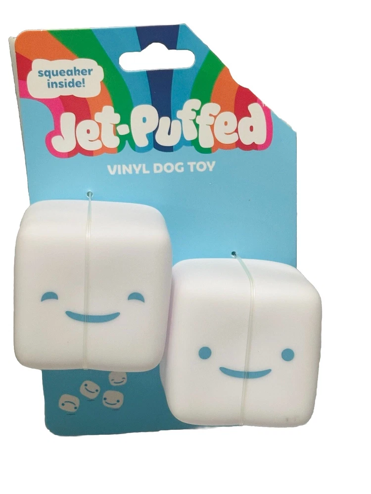 This Jet-Puffed Squeak Vinyl Dog Toy is the perfect addition to your furry friend's toy collection. Made from high quality vinyl material, this chew toy is durable and will keep your dog entertained for hours. The squeaky feature adds an extra level of excitement to the gameplay, making it a great choice for dogs of all sizes. The toy is designed to be a great choice for pet owners who want to keep their dogs happy and entertained. Its features include a squeaky sound that can be heard from a distance, making it perfect for dogs that love to play and bark. This chew toy is ideal for pets that are looking for a fun and engaging activity, and it is sure to keep them entertained for hours. Tag is cut. See photos attached.