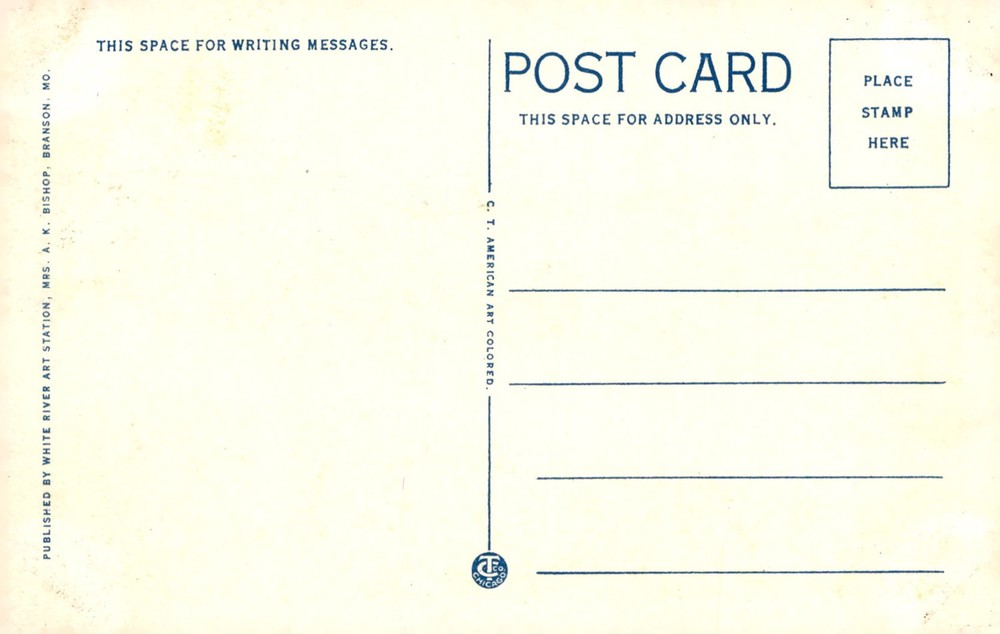Explore the scenic beauty of Branson and Lake Taneycomo captured by White River Art Station. This postcard features a colorful American art rendition, perfect for sending messages.