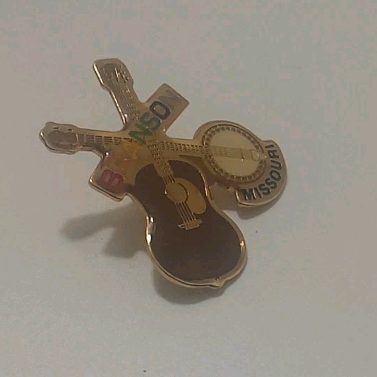 The Branson Missouri Guitar Banjo Lapel Hat Pin is a collectible item featuring a unique design inspired by the popular tourist destination in Missouri.