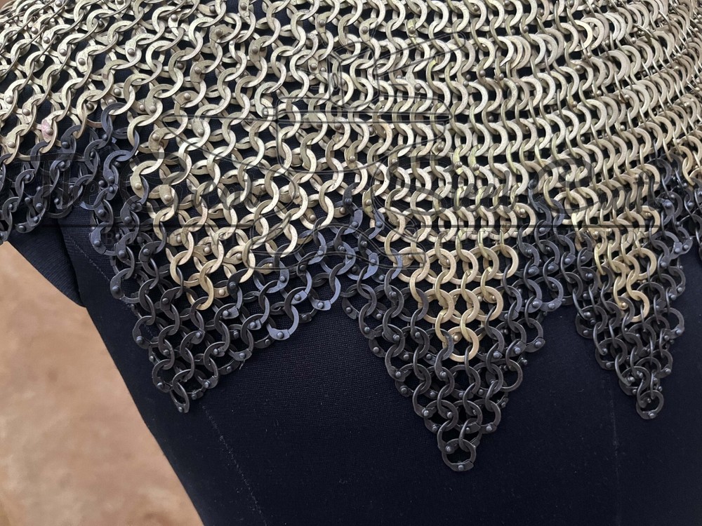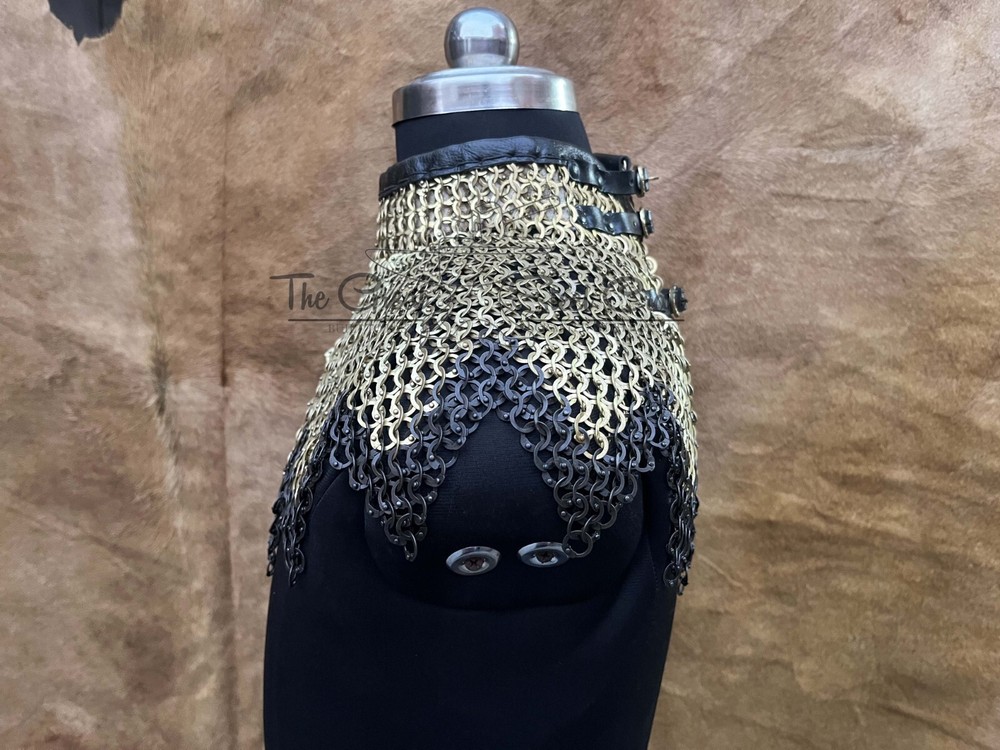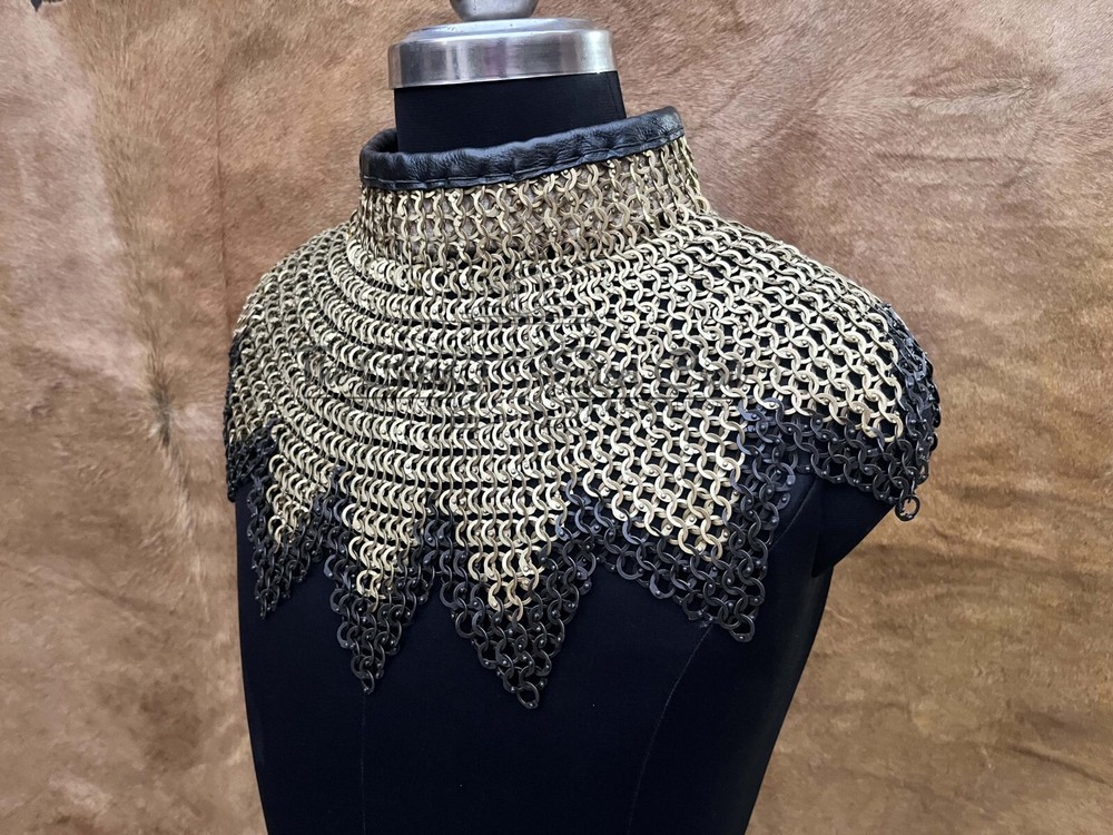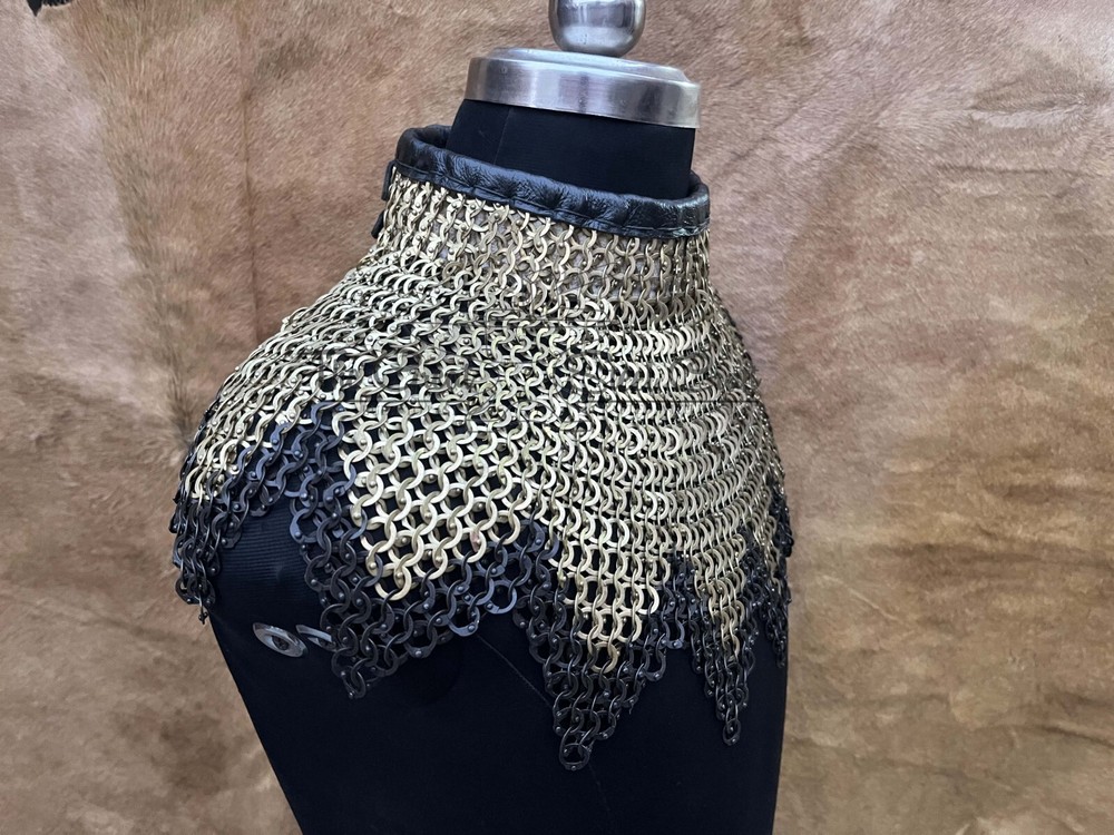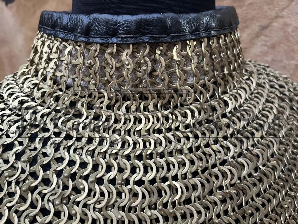 Brass Chainmail Collar, 8mm flat ring dome riveted Neck Protection zig-zag bottom black ring Larp & Reenactment chainmail collar/ Sca Details:- 8mm Flat rings alt Solid Rings Dome Riveted Bottom Zig-Zag black ring in mild steel With 3leather stripes with buckles for adjusting Material: Brass & Mild Steel leather collar Construction with 2/3 Steel rows Ring size: 1.2mm wire - 8mm Finish: Golden & Black Measurements: Upper collar circumference:- 50cm - 55cm Bottom coif circumference:- 120cm -125cm Collar length:- 5cm - 6cm Coif length:- 18cm - 20cm It's standard size for all adults If you want custom size write me a message Please Note:- We Do not Ship on APO / FPO Military Addresses, Po Box address as our Courier partners do not book international parcels on these address. Please note that - depending on your geographic location Shipping carriers or methods may change. * Normal delivery time is 6-8 working days from the time of item dispatch. Please note, delivery time can take more time in some different transit conditions like custom clearance, lack of proper address, address change or some other reasons - Contact Us : If you have any query or problem then feel free to contact us through eBay Message system Or Click on "Ask a Seller" tab below each listing. We reply within 24 hours. Please Note Import Duties taxes, Vat, quarantine fees, address change fees, or any other taxes are not included in the item price or in shipping charges. These charges are the buyer's responsibility. You are requested to please check with your country's custom office to determine what these additional cost or taxes etc. before bidding / buying this item(s) Import Duties or Taxes : We do not have any control on customs charges or custom clearance time or on any other charges; hence, the delivery time is for reference only. Sellers are not responsible for shipping service transit times. Transit times may vary particularly during peak periods. Customs duty fees are normally charged by the shipping company or collected when they deliver the parcels. Feedback : If you feel any problem in product please immediately contact us as we ensure fast and best solution for any problem got in our product !!Thank you so much for Visiting My Shop!! !We welcome you to reach out with confidence!