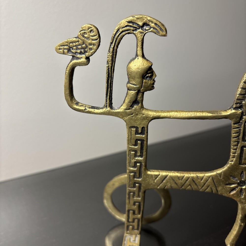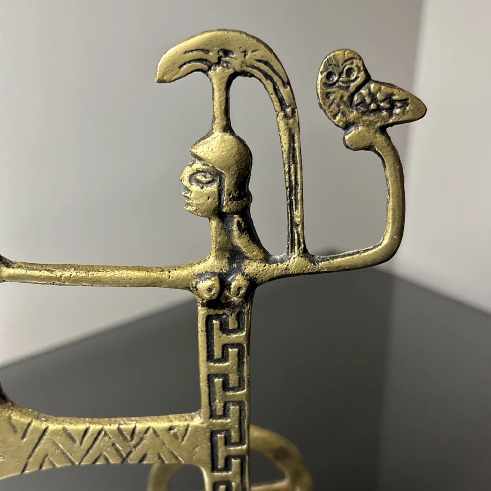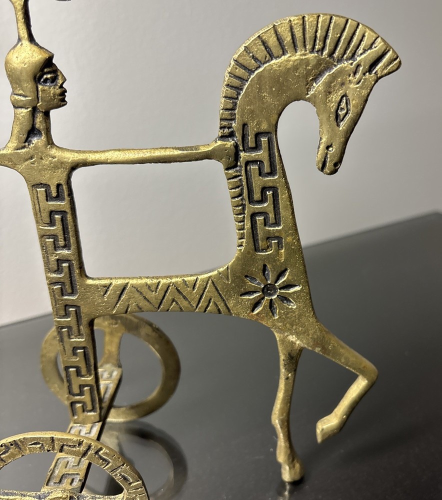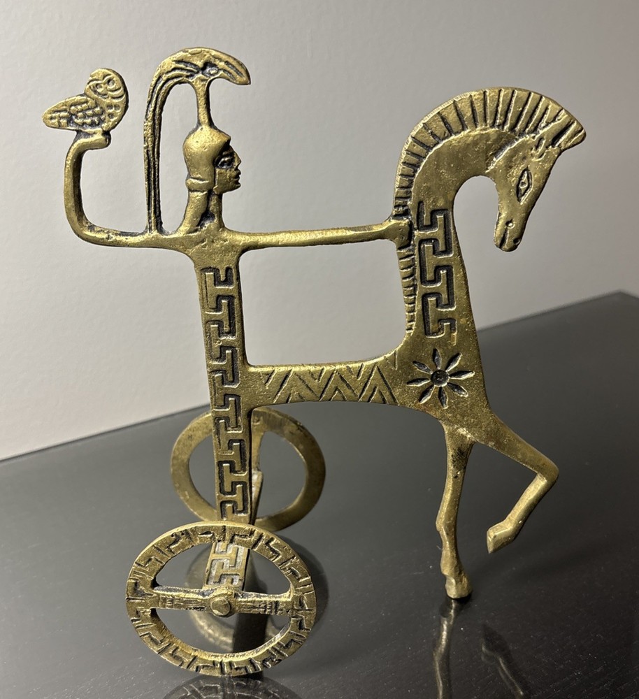The product is a 7.5" tall Etruscan horse chariot sculpture, appears to be brass adorned with intricate details depicting a Greek warrior riding on the back of a horse holding an owl. In the style of F Weinberg The sculpture is a representation of ancient artistry and craftsmanship, showcasing a blend of realism and stylization typical of Etruscan and Greek sculptures. , this sculpture captures the essence of the Classical period with its depiction of the horse and warrior figure, making it a unique and visually striking piece for any art collection.