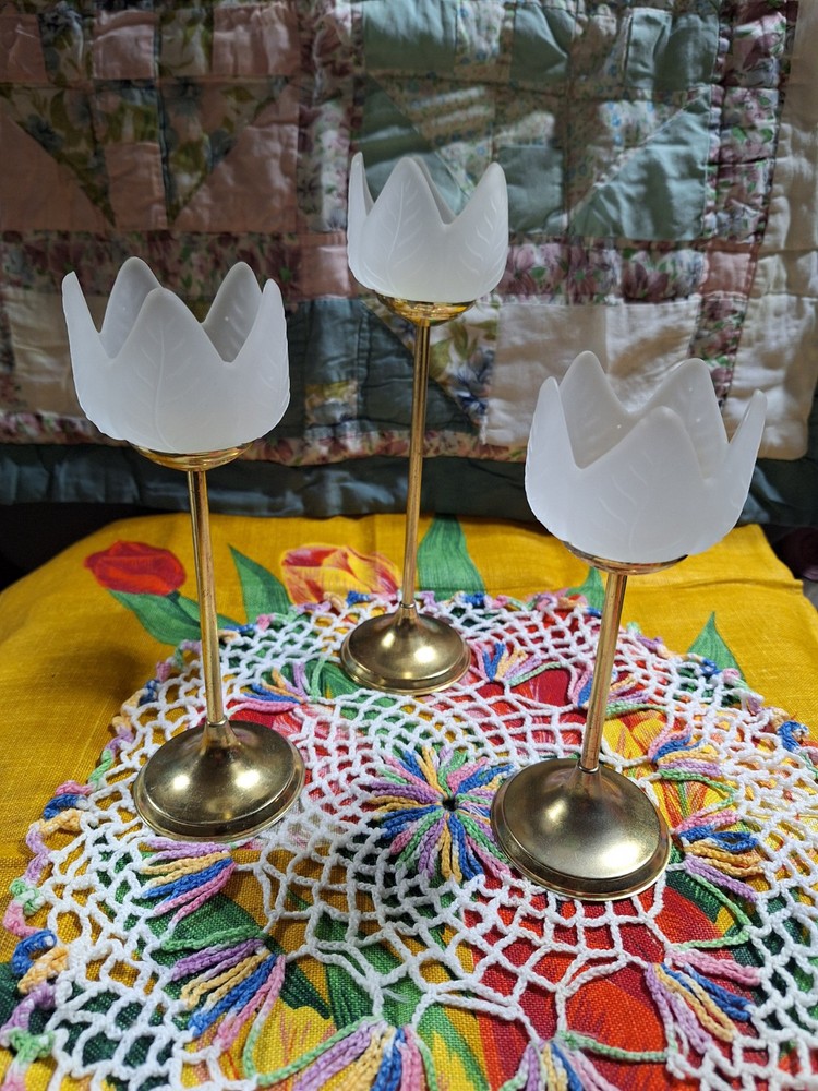 The Brass And Frosted Tulip Shaped Glass Tea Light is a decorative candle holder that features a tulip-shaped glass design with a frosted finish. The combination of brass and frosted glass gives the piece an elegant and timeless look, making it a stylish addition to any home decor. This tea light holder is perfect for creating a warm and cozy atmosphere when lit, making it a charming piece for both everyday use and special occasions.