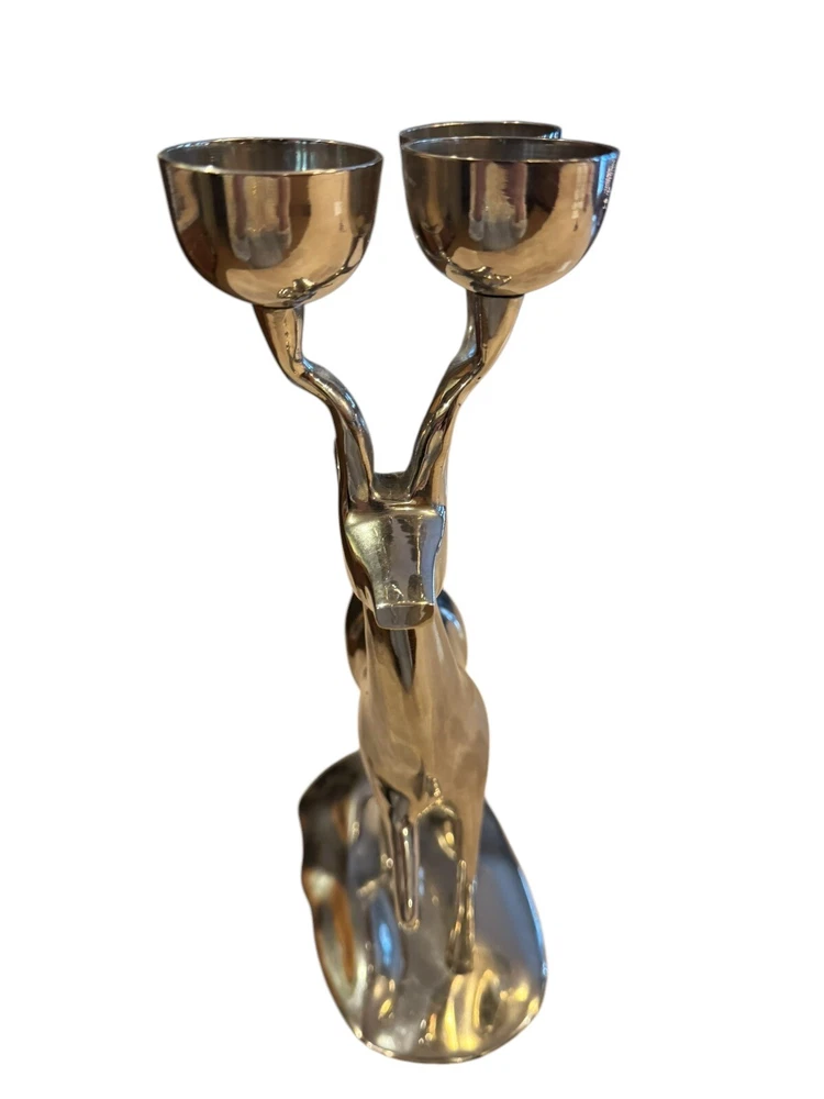 Add a touch of holiday magic to your home with this elegant Brass Reindeer Candle Holder. The nickel finish and intricate antler design make it a perfect addition to any Christmas decor. Use it to hold your favorite scented candle and let the warm glow fill the room. Crafted with care, this candle holder is not only beautiful but also functional. The six-inch diameter makes it perfect for any standard candle, and the sturdy construction ensures that it will last for years to come. Whether you're looking for a thoughtful gift or simply want to add some festive cheer to your own home, this Brass Reindeer Candle Holder is sure to impress.