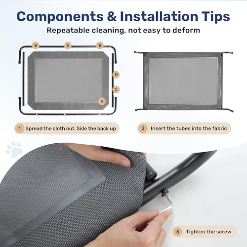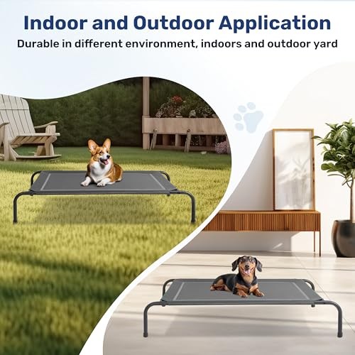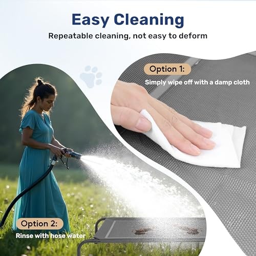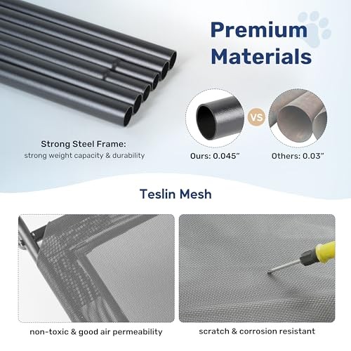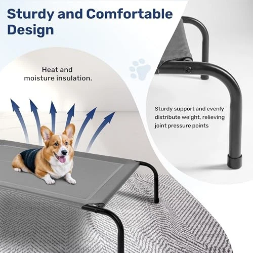 Love this elevated dog bed—keeps my pup cool and comfy with its breathable mesh! The sturdy metal frame and no-slip feet make it perfect indoors or outdoors. Easy to clean, and my dog loves the extra airflow. Fast shipping and great return policy—highly recommend!