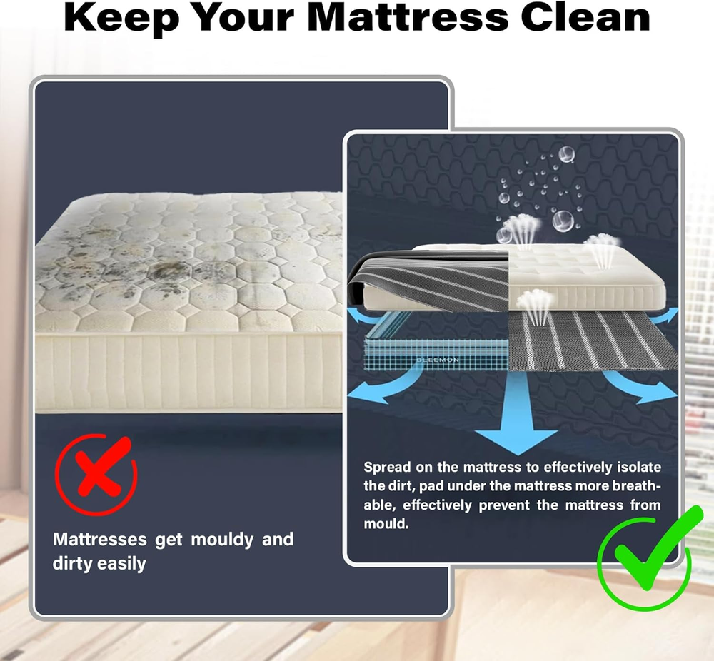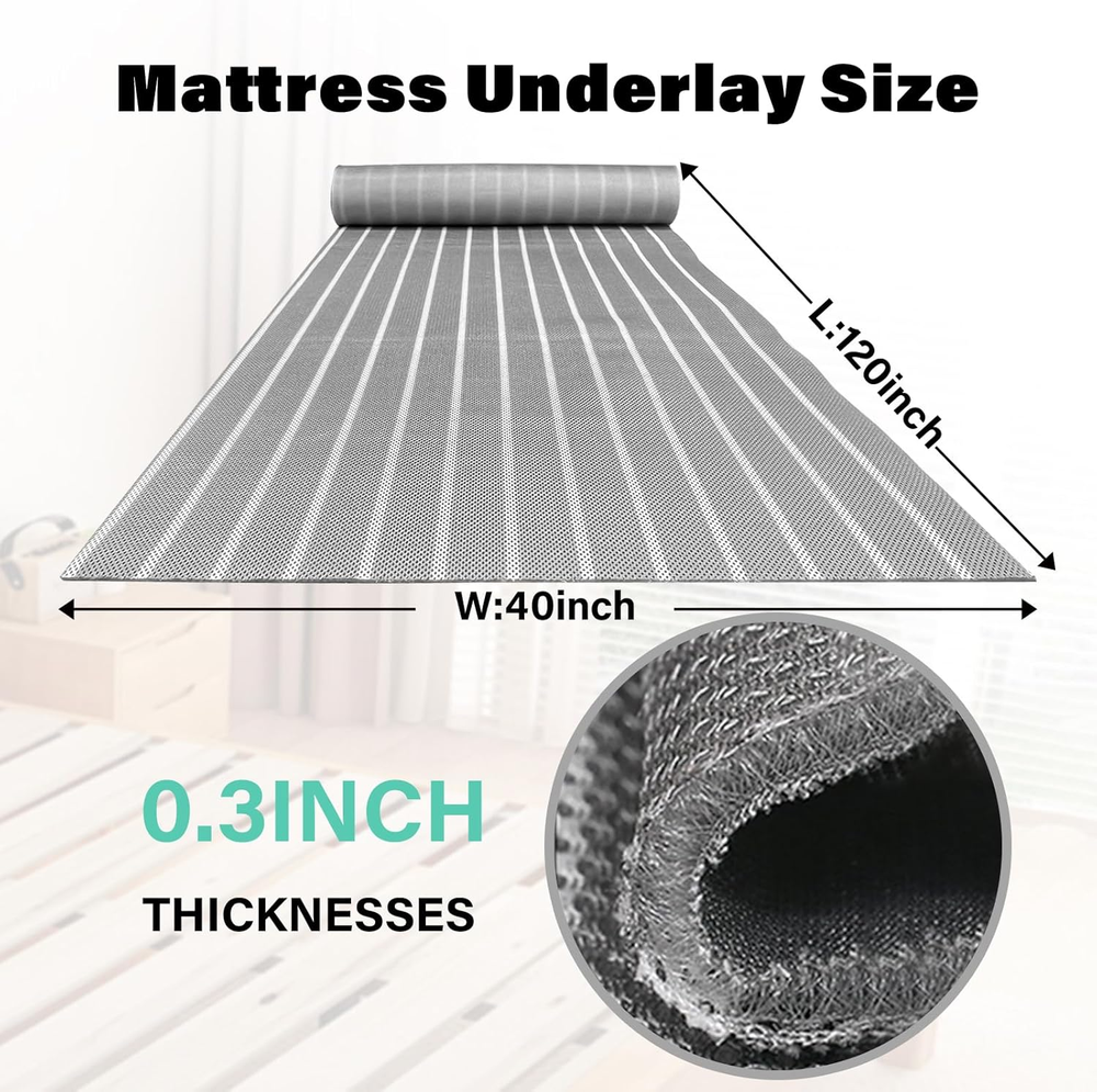 DOUBLE LAYER BREATHABILITY DESIGN: The mattress underlay is designed with double-layer breathable holes, the surface is large honeycomb breathable holes, and the bottom is 3D mesh breathable holes, air circulation keeps your mattress dry. POLYPROPYLENE MATERIAL: The Under mattress pad is made of polypropylene material, three layers of fiber fabric, can support more than 3,000 pounds of weight, strong resilience, not easy to deform. Breathable and can be reused many times. LARGE SIZE AND CUTTABLE: The size of our RV under mattress ventilation is 118.1in L*39.3 in W*0.3 in H, the large size can meet your daily needs. The size of the RV liner can be DIY cut to fit Queen, King and Twin mattresses. MULTIPLE USES: Our hypervent aire-flow mattress underlay can be widely used in bedrooms, RVs, boats, and campers to keep away from moisture and keep your mattress dry. Can be used in all kinds of weather, keep your underbed airflow and stay clean. LIGHTWEIGHT AND EASY TO INSTALL: Our mattress underlay is very lightweight, foldable and portable, easy to install, just lay it on the bottom of the mattress and use it, bring you a comfortable sleeping experience. Product Description