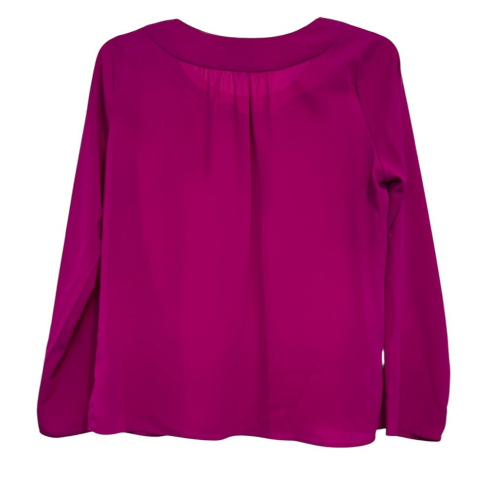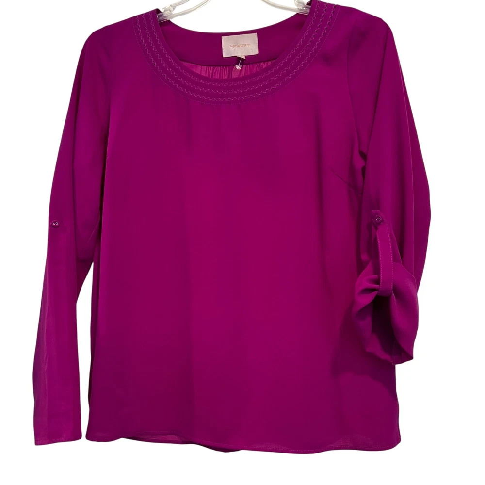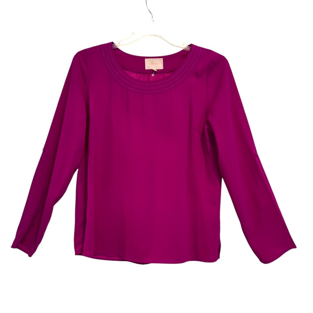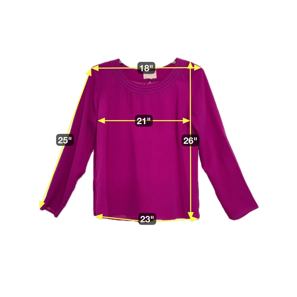 Skies Are Blue | Brecken Meggen Fuchia Blouse Roll Tap Sleeves Size XL Business Casual, Office Attire , Chic Top Vibrant and chic, the Skies Are Blue Brecken Meggen blouse in fuchsia adds a bold pop of color to any wardrobe. Featuring roll-tab sleeves and a relaxed fit, this top is perfect for work, brunch, or casual outings. Pair with trousers or jeans for versatile styling. Approximate Measurements Chest Width: 21.0 in. Shoulder Width: 18.0 in. Body Length: 26.0 in. Sleeve Length: 25.0 in. Bottom Hem Width: 23.0 in. Excellent used condition, no stains, no holes Skies Are Blue fuchsia blouse roll tab sleeves women's XL top casual blouse workwear top bright pink shirt business casual relaxed fit everyday wear