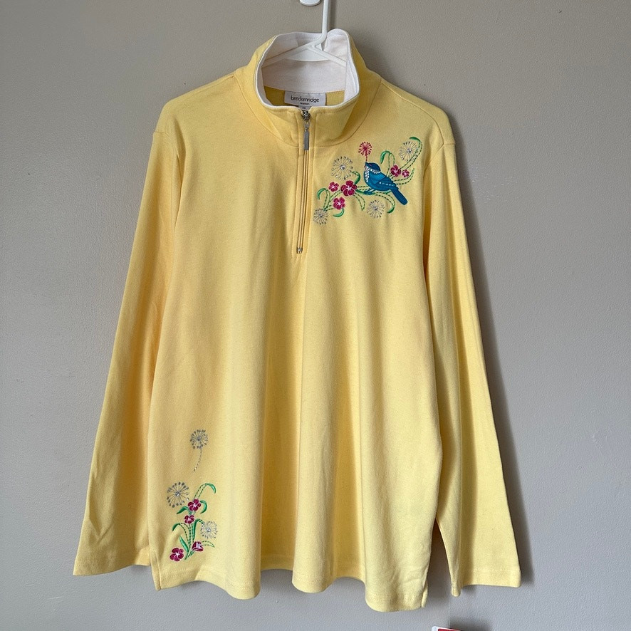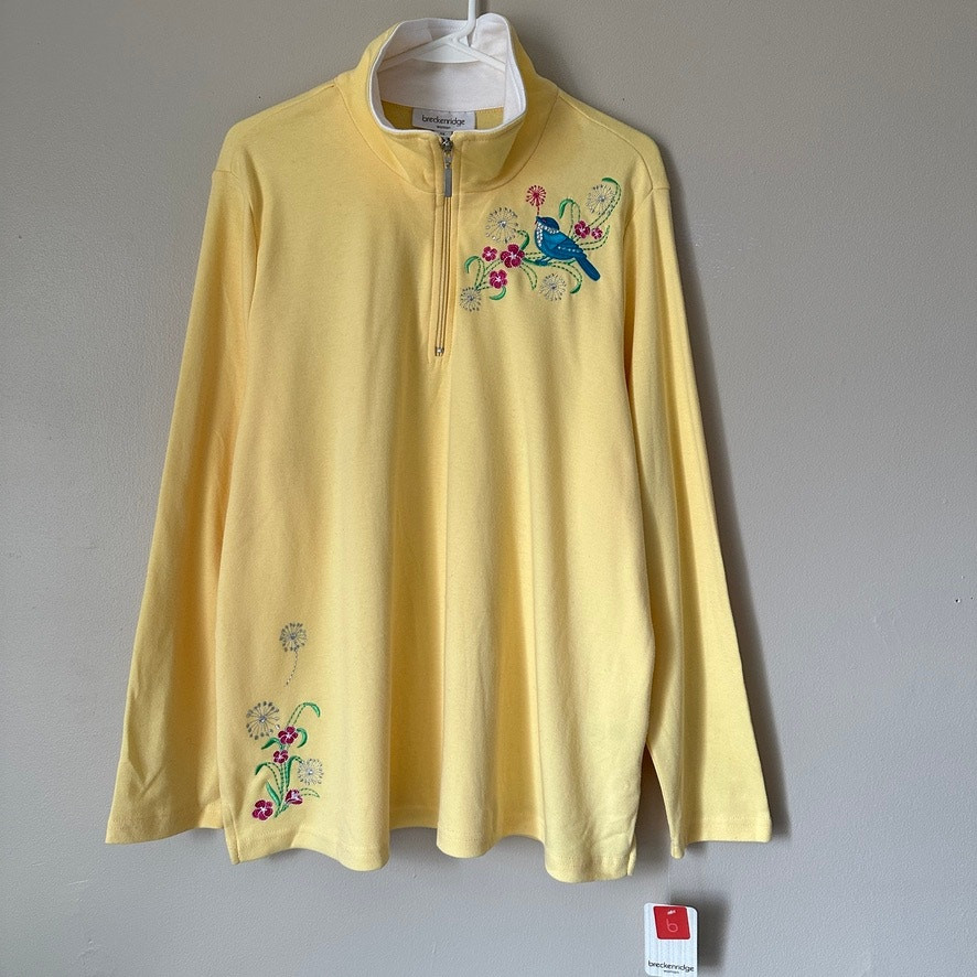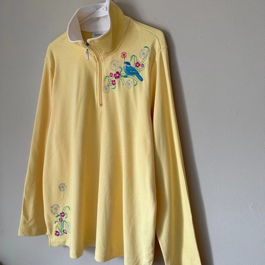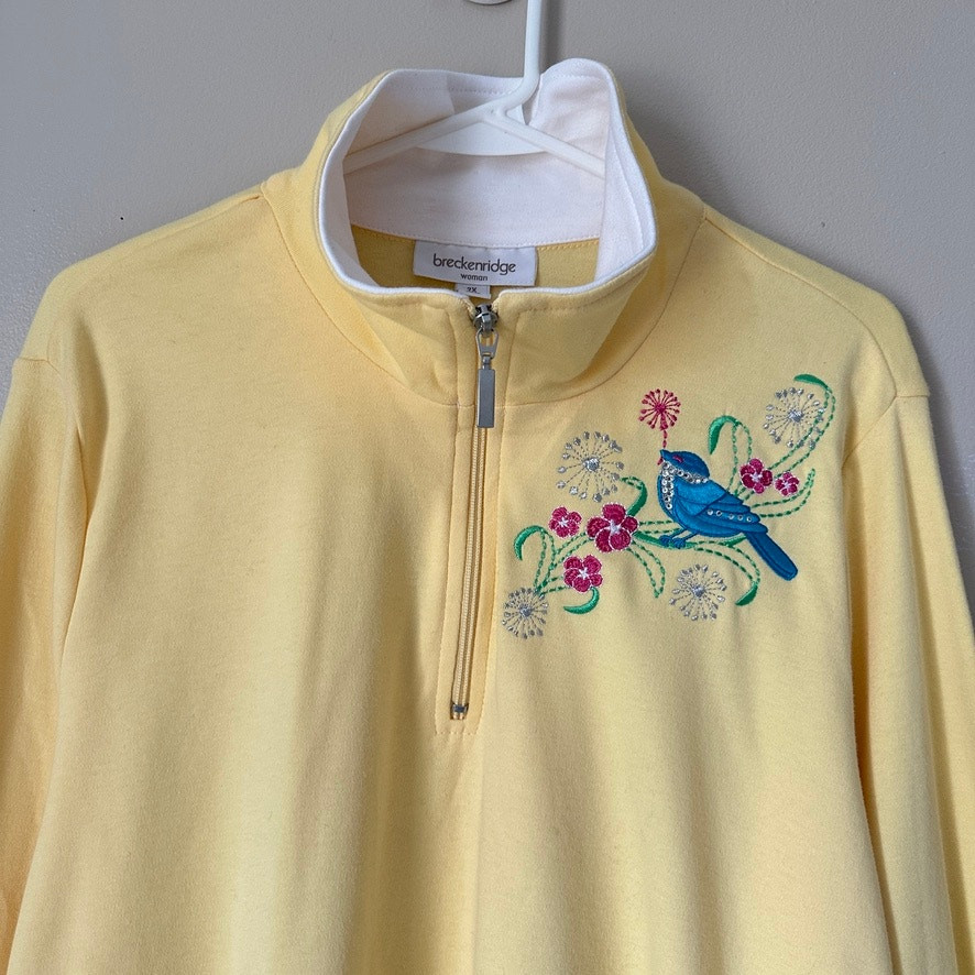 Breckenridge 1/4 Zip Pullover Top Womens Plus 2X Embroidered Bird Floral Grandma Yellow Size: 2X Approx. measurements: 25" across (pit to pit), 28" long (shoulder to hem) Condition: Pre-owned excellent. Pre-loved and in gently used condition. Light wear. no stains, rips, or holes. - see all pics for any wear/condition Actual colors may vary. We do our best to ensure that our photos are as true to color as possible. However, due to photographic lighting sources, inconsistencies of various monitors settings, we cannot guarantee that the color you see accurately portrays the true color of the product. grandma, grandmacore, casual, garden, gardener,