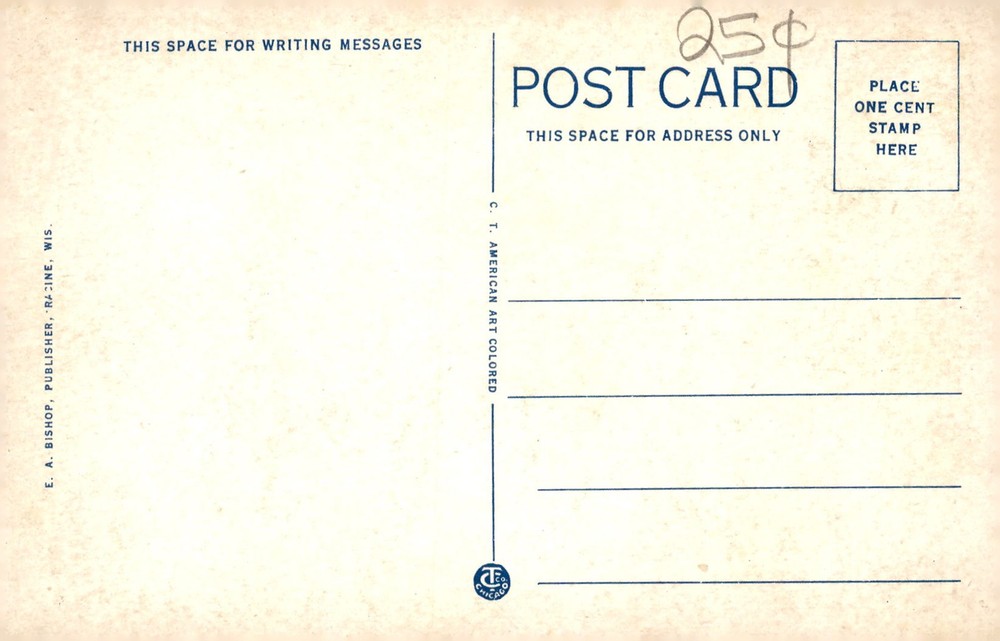 Vintage postcard featuring a scenic bridge at the east entrance to Horlick Park in Racine, Wisconsin. Published by E. A. Bishop.