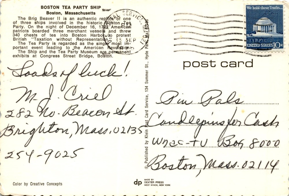 MAKE AN OFFER. THE MORE YOU BUY THE BETTER DEAL I WILL ACCEPT The front of the postcard features the Brig Beaver II, The Boston Tea Party Ship, located in Boston, Massachusetts. The Brig Beaver II is an authentic replica of one of the three ships involved in the historic Boston Tea Party, which took place on the night of December 16, 1773.