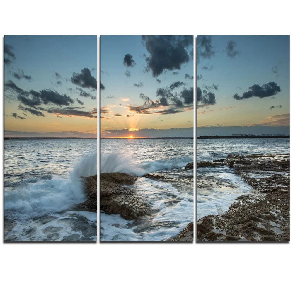 This beautiful Photography Canvas Art is printed using the highest quality fade resistant ink on canvas. Every one of our fine art giclee canvas prints is printed on premium quality cotton canvas, using the finest quality inks which will not fade over time. Each giclee print is stretched tightly over a 1 inch wood sub frame ensuring the canvas is taught and does not buckle. This canvas art print is gallery-wrapped (the design continues on the sides) , giving it a real art gallery feel. All of our canvas prints are carefully packaged with bubble wrap, fragile labeling and sturdy boxes to ensure a safe delivery. Every canvas print arrives ready to hang on the wall, with the hanging kits included Period: ContemporaryOrientation: HorizontalSubject: Photography, Sea & Shore, Matching Set, Free Shipping Over $49.99* Details Bright Sydney Sunset Over Sea - Seashore Canvas Wall Artwork Print Product Description: This beautiful Photography Canvas Art is printed using the highest quality fade resistant ink on canvas. Every one of our fine art giclee canvas prints is printed on premium quality cotton canvas, using the finest quality inks which will not fade over time. Each giclee print is stretched tightly over a 1 inch wood sub frame ensuring the canvas is taught and does not buckle. This canvas art print is gallery-wrapped (the design continues on the sides) , giving it a real art gallery feel. All of our canvas prints are carefully packaged with bubble wrap, fragile labeling and sturdy boxes to ensure a safe delivery. Every canvas print arrives ready to hang on the wall, with the hanging kits included PeriodContemporary OrientationHorizontal SubjectPhotography, Sea & Shore, Matching Set, Modern, Decorative, Horizontal TypeCanvas Art, Fine Art, Fine Art Giclee, Print, Wrapped MaterialCanvas, Cotton, Wood StylePhotography, Sea & Shore, Matching Set, Modern, Decorative, Horizontal Number of Pieces3 FramedFramed Exact ColorBlue SizeLarge ColorWhite, Blue