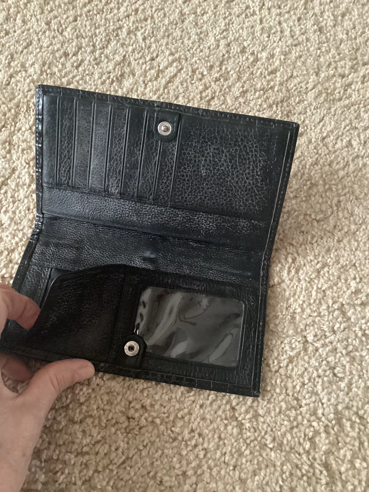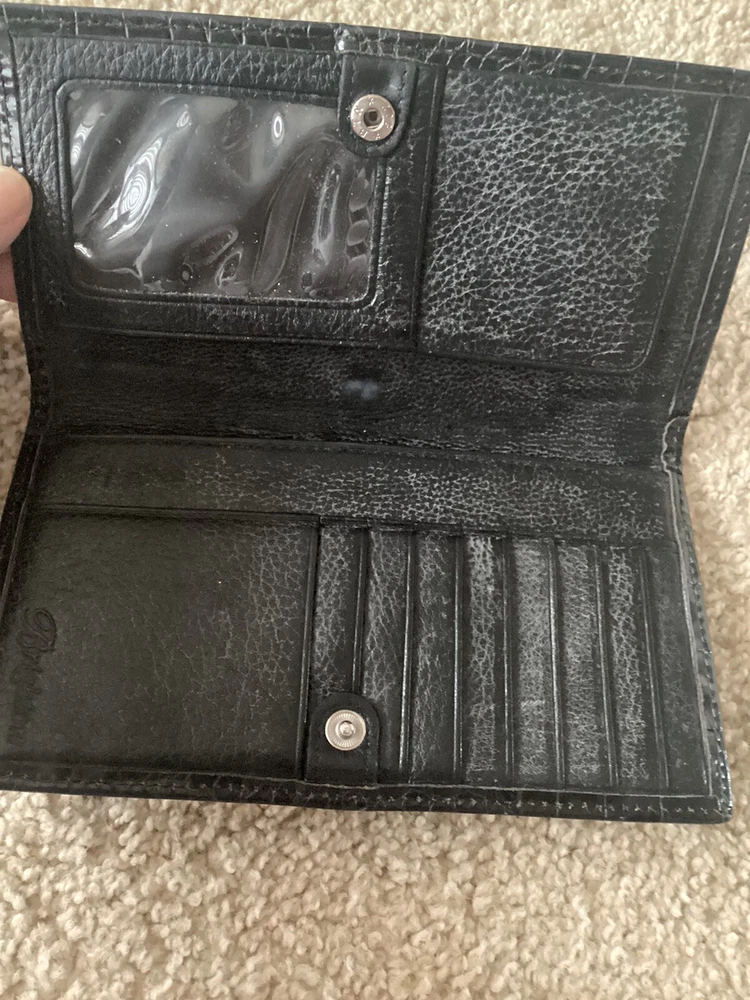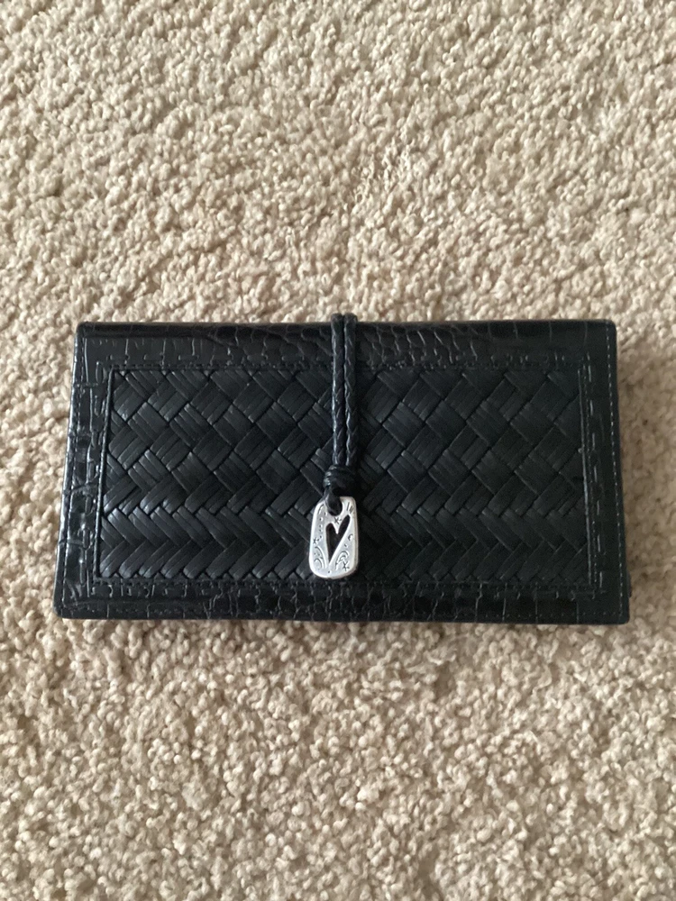 Type:Bifold WalletCharacter Family:n/aColor:BlackFabric Type:leatherCountry/Region of Manufacture:ChinaDepartment:WomenAccents:Heart Charm, Woven LeatherTheme:South Western, WesternMaterial:LeatherCharacter:n/aStyle:bi-foldFeatures:Credit Card, Folding, Photo ID holder, Pockets for bills and receipts, Will fit a checkbookManufacturer Color:BlackBrand:BrightonHandmade:NoPattern:Herringbone, Woven, AlligatorSize:MPersonalize:No