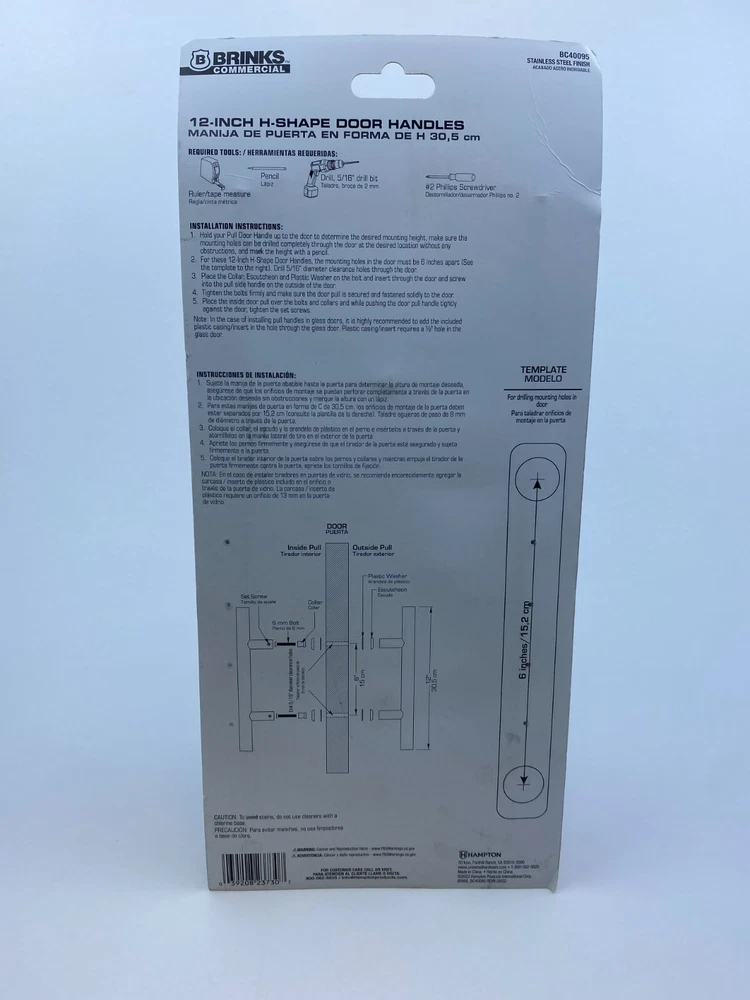 Material: Stainless Steel Finish: Stainless Steel MPN: BC40095 Color: Silver Number in Pack: 2 Brand: Brinks Model: BC40095 Items Included: Drilling Template, Hardware, Instructions Features: Easy to Install, Industrial Suitable For: Commercial Item Height: 12 in. UPC: 039208237307 gtin13: 039208237307 Type: Door Handle Country/Region of Manufacture: China Shape: H Shape