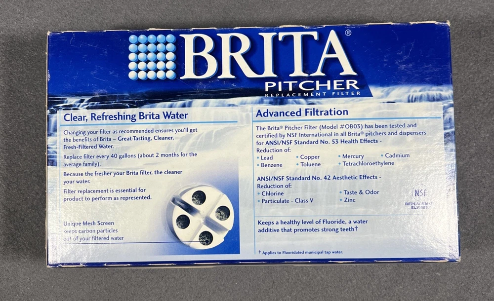 This is a pack of four genuine OEM Brita Standard Water Filter Replacements designed for Brita Maxtra+ water pitchers. Made of charcoal material, these filters use carbon/charcoal filtration method to remove lead and mercury contaminants from water. Each filter has a capacity of 40 gallons and is suitable for household use. The model number is 42432 and it is made in Canada. Each filter weighs 1.11 lbs.