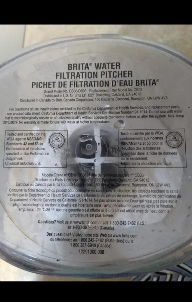 This is a Brita Water Filtration Pitcher, Model No. OB36/OB03. 10 Cup This Everyday water pitcher is made without BPA, easy to fill, fits in most fridges and can hold 10 cups of water, enough to fill 3 24-ounce reusable water bottles. This Brita pitcher features an easy-fill lid to make refills a breeze; Height 10.7"; Width 5.4"; Length/Depth 10.1"; Weight 1.3 pounds Get great tasting water without the waste; by switching to Brita, you can save money and replace 1,800 16.9 fl. oz. single-use plastic water bottles a year Only Brita filters are certified to reduce Chlorine (taste and odor), Copper, Mercury, Lead and Cadmium. Standard filters are compatible with all Brita pitchers and dispensers except Stream; replace the Brita Standard water filter every 2 months Filtration Method: Carbon/Charcoal This is a pre-owned item in good condition; no filter is included