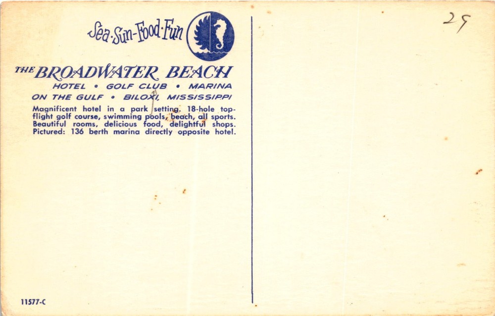 MAKE AN OFFER. THE MORE YOU BUY THE BETTER DEAL I WILL ACCEPT The postcard advertises The Broadwater Beach Hotel in Biloxi, Mississippi, as a destination for sea, sun, food, and fun. The hotel is described as magnificent, set in a park setting with beautiful rooms, delicious food, and delightful shops.