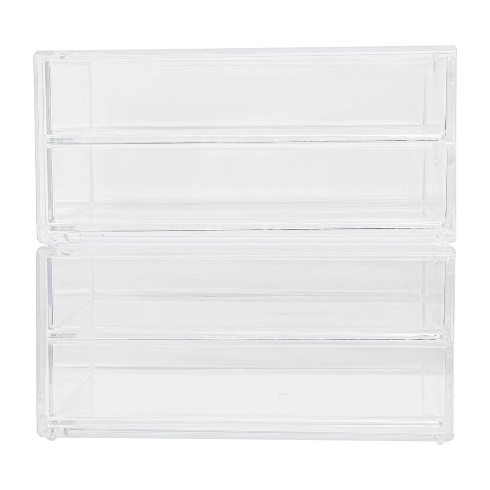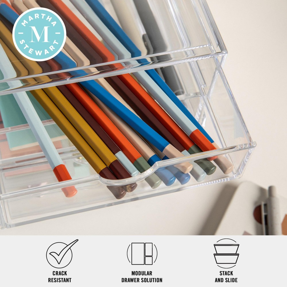 Organize a multitude of supplies and accessories with this Set of 2 Brody Organizer Boxes with Drawers and keep all of your surfaces clutter-free. Premium BPA-free and crack-resistant plastic holds up well in almost any environment from your desktop to your bathroom vanity for many years of use. The removable drawers are accented with a half-moon cutout for easy opening and closing while the crystal clear housings make locating your items effortless. The stackable design enables you to use vertical instead of horizontal real estate, which makes this storage drawer set a great space-saver. Lower grooves lock in place for stability and non-skid feet ensure the boxes stay in your desired location to maintain a neat and tidy appearance. Easily locate pens, pencils, makeup brushes or coupons while maintaining neat and tidy spaces with this Set of 2 Stackable Organizer Boxes with Pullout Drawers Stackable design allows for vertical configurations while lower grooves lock in place for stability and non-skid feet keep each unit in place Premium crack resistant and BPA free plastic with half-moon cutout for easy opening and closing No assembly required and clean with damp cloth Dimensions (2) - 6"W x 7.5"D x 3.5"H